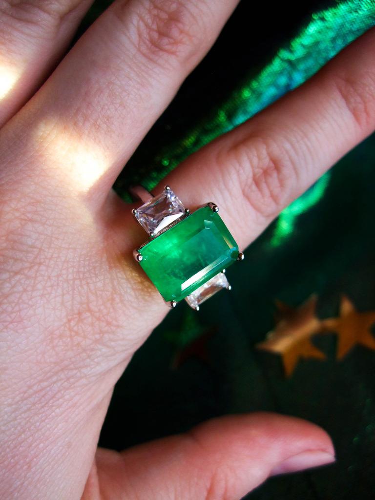 Ранее уже заказывала такое кольцо в бирюзовом цвете. Как и у бирюзового камня, у зеленого есть прожилки внутри. Размерный ряд 6-10. Я заказала 10 размер (для мамы). Внутренний диаметр кольца 1,9 см. У мамы крупные руки. Такие большие камни (0,9 на 1,4 см) органично смотрятся на ней. В комплекте подарочная коробка, мешочек из ткани под органзу и салфетка для ухода за украшениями (она тут пригодится: на гранях остаются отпечатки пальцев, нужно протирать). Зеленый камень не менее красивый по цвету, чем бирюзовый. Сделано качественно.