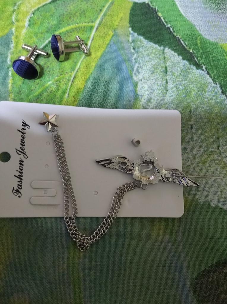 Галстук ОТЛИЧНЫЙ! И запонки, и платок! А вот Брошь другую подложили. Просто в первую очередь, я этот галстук заказывал из-за Броши в виде "крылышек" как на картинке. Три звезды поставил, за то что фактический товар не соответствует на фото в карточке товара в приложении.