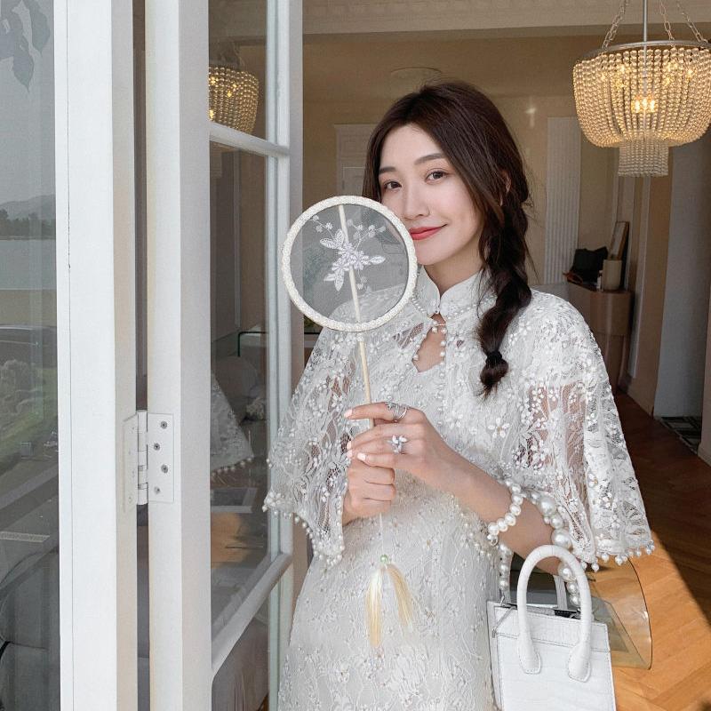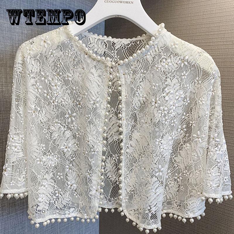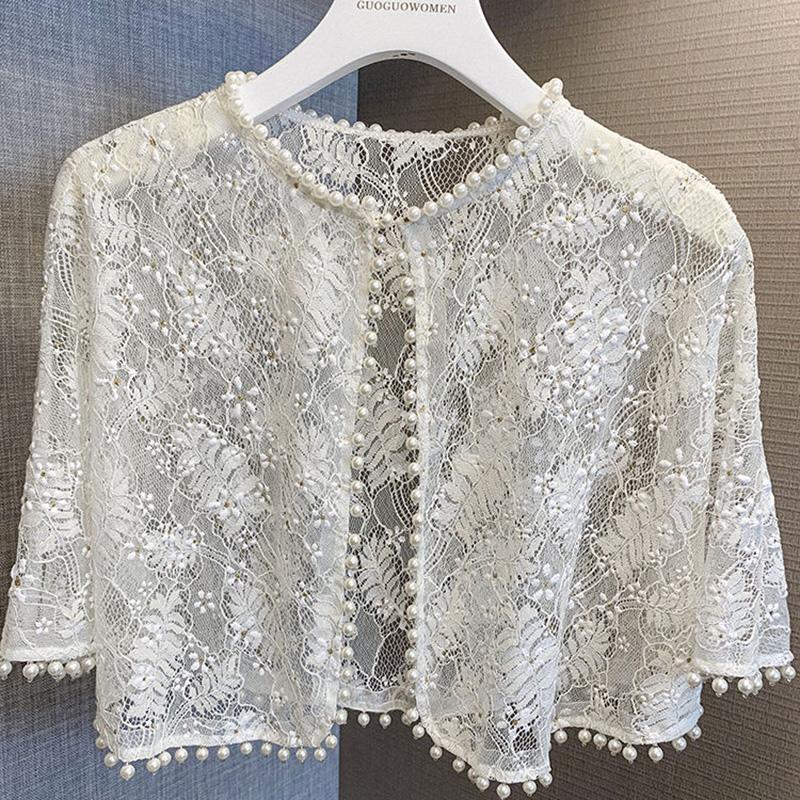 Кружевной кардиган с жемчужной отделкой, женский солнцезащитный летний короткий однотонный тонкий шаль, 1 шт., элегантный кардиган