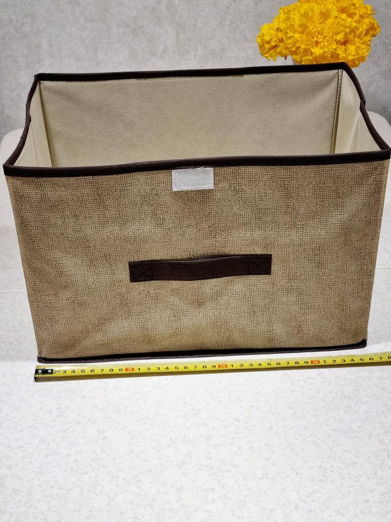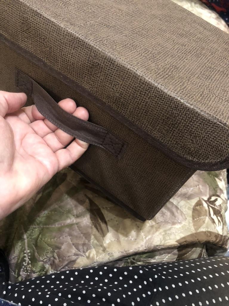 Коробка для хранения. Заказала с крышкой для хранения шапок, шарфов и варежек. Выглядит минималистично, гораздо лучше, чем обычная коробка, сохранит чистоту вещей, защитит от пыли. Органайзер из нетканого материала, на застёжке липучке. Стенки, дно и крышки усилены картоном. У меня размер L: ширина 37 х глубина 24 х высота 24 см. Есть ещё S и другие цвета. По месту мне идеально подошла. Доставка около месяца. Упаковка в почтовый пакет. В сложенном виде короб для хранения плоский и компактный, лёгкий. Рекомендую.