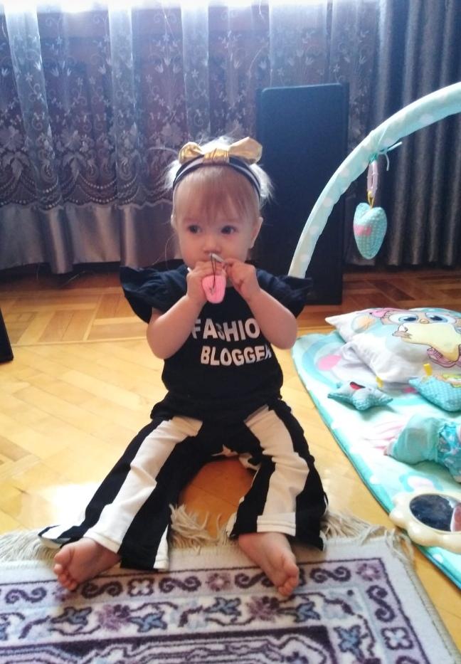 Ну это вообще крутой костюм, брюки клёш👍, ваще! Как увидела его, сразу заказала, теперь сама сделаю такую же повязочку на голову из двух повязок, заказала чёрную сумку и чёрные очки. Спасибо продавцу и сайту. Размер заказала 1-2 года, на кофточке размер 80 стоит. На фото внучке 10 месяцев, костюм очень ещё большой.
