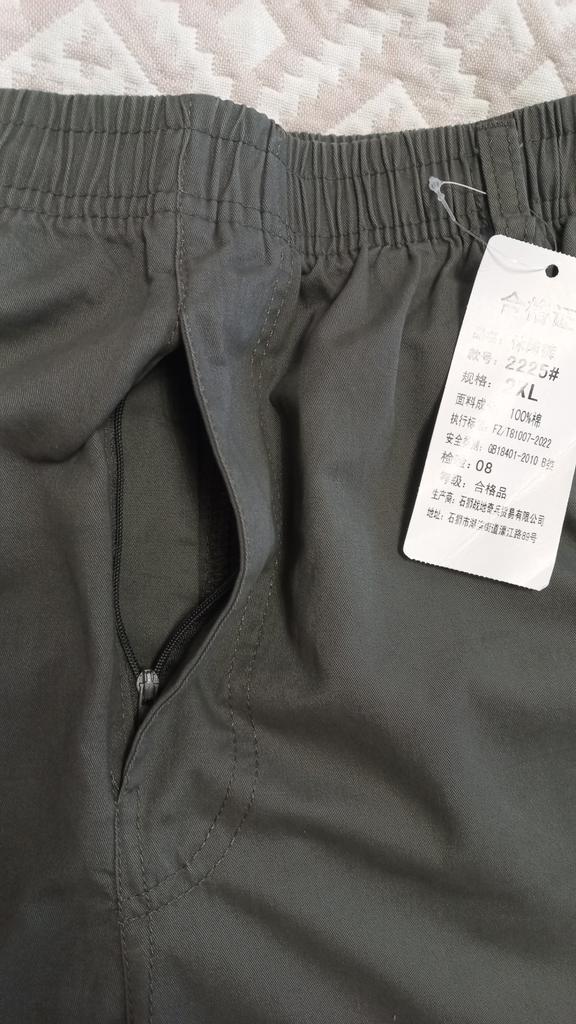 Брюки с молнией, но резинка не разъёмная, с простроченным гульфиком. Резинка по талии, шнурок внутри. Карманы настоящие, всего 4. Ткань - плотный хлопок. Сверху похож на сатин, изнутри на ситец по переплетению. Без рубчиков, как тут некоторые пишут. Размер XXL на 52-54 размер подходит. По талии 80см/108см в растянутом виде. Длина 105 см. В бедрах 120 см. Цвет тёмно-зеленый как наш тёмно-серый. Пошив качественный, хоть нитки и торчат. Строчки двойные по бокам, кокетке сзади, клапанам карманов. Есть шлёвки. Пуговки на задних карманах серо-коричневые.Цена 1085 р устроила. Можно брать.