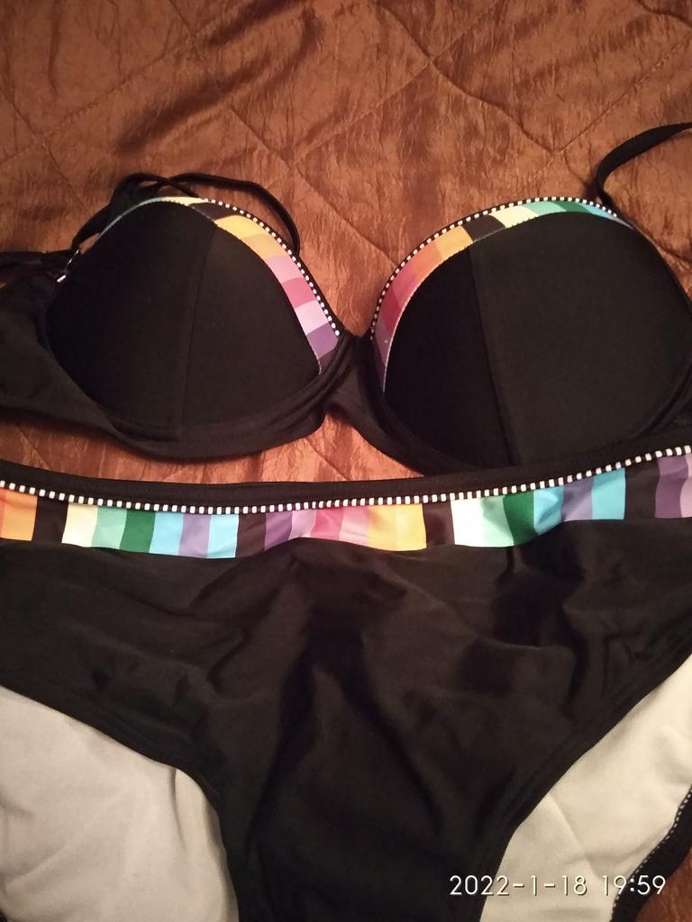 Купальник обошелся мне в 860 рублей. Шел долго, трек отслеживался. Еще успею обновить его в этом сезоне. Бюстгалтер, как на меня шили. Чашечки отделаны не очень аккуратно, белые швы могут быть видны, эти края нужно плотно прошить черной ниткой. Снизу чашечек косточки, вроде, пластиковые. Я вешу 90 кг, ОГ 110 см. Ношу бюстгалтер 4 размер. Плавки кажутся большими, на мне практически как раз, они с высокой талией. Внутри плавок по всему изделию сетка, это я встречаю впервые. Обычно женские плавки одинарные. По ощущениям, сеточка меньше, чем внешняя ткань плавок, поэтому как сели плавки на мне, пока не могу понять. Ощущение, что сетка мешает плавкам сесть вплотную к коже. Возможно, вода исправит этот диссонанс. Или уберу эту сетку совсем. Сам купальник очень яркий, броский, на загорелом теле смотрится привлекательно. Ставлю четыре звёзды.
