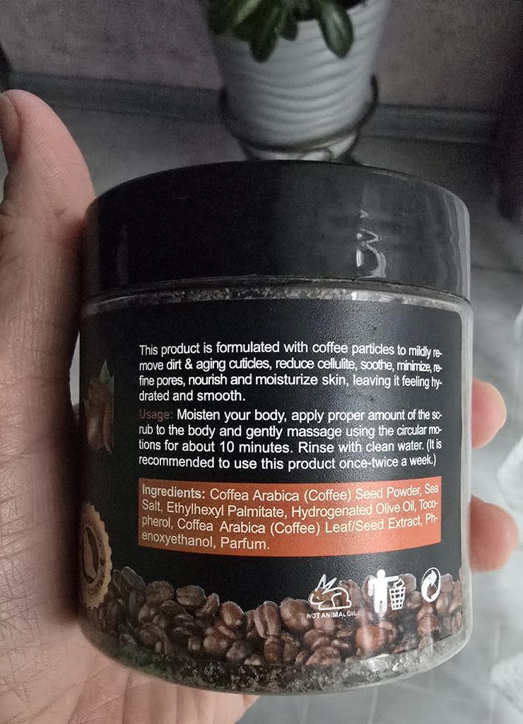 Ммммммм... Запах у скраба невероятный. После использования на коже остаются масла и обеспечивают питающий эффект. И кожа выглядит увлажнённой и здоровой. Мне очень понравилось, как он работает на огрубевшей коже моих локтей. После 10-ти применений кожа перестала шелушиться и болеть. Что указано на упаковке: ARABICA COFFEE SCRUB специально разработан для активного борьбы с целлюлитом, растяжками, акне и экземой. Содержит кофеин только из лучших бобов арабики, смешанный с увлажняющими, регенерирующими и отшелушивающими маслами и солями. Применение: В душе нанесите скраб на кожу круговыми массажными движениями. Дайте ему высохнуть на пять минут, а затем смойте. Для достижения наилучших результатов повторяйте каждый раз, когда принимаете душ. Состав: Dead Sea Salt, Organic Kona Coffee,Olive Oil, Sweet Almond Oil, Coffee Arabica Seed Oil, Coconut Oil, Organic Shea Butter, Cacao Extract, Grounded Coffee Arabica (coffee) Bean. Промокод нннада? YBR9S9TJCT Нажмите на текст ещё раз, чтобы промокод стал красным и забирайте.