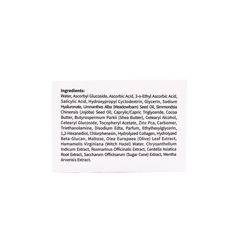 water, ascorbic acid glucoside, ascorbic acid, 3- o-ethyl ascorbic acid, salicylic acid, hydroxypropyl cyclodextrin, glycerol, sodium hyaluronate, limnanthes alba(meadowfoam) seed oil, simmondsia chinensis(jojoba) seed oil, caprylic acid/capric acid triglyceride