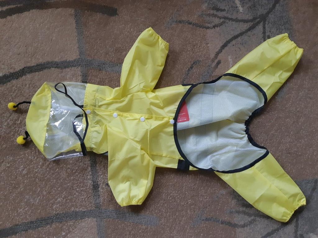Все супер. Шло 2 недели до Москвы. На собаку 70см длину и 68 обхват груди подошёл размер. Швы отлично сделаны, не рвётся не промокает. Крылья лишние, но не особо мешают.