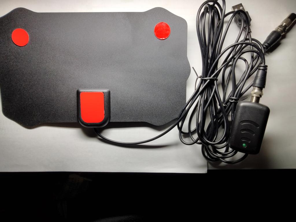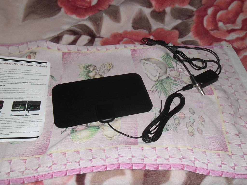 Выиграл за 1 рубль. Сама антенна гибкая из похожего на жесткую резину материала. На задней стороне липучки - можно приклеить на окно, стену, шкаф. Длина провода 3 метра до блока усиления и от него еще сантиметров 80. Провод USB такой-же длины можно включать в блок питания или в телевизор (если есть такой порт). По сравнению с моей старой антенной выглядит очень хорошо. Включил - работает. У меня до телецентра километров 10. Как будет работать на большем расстоянии оценить не могу.