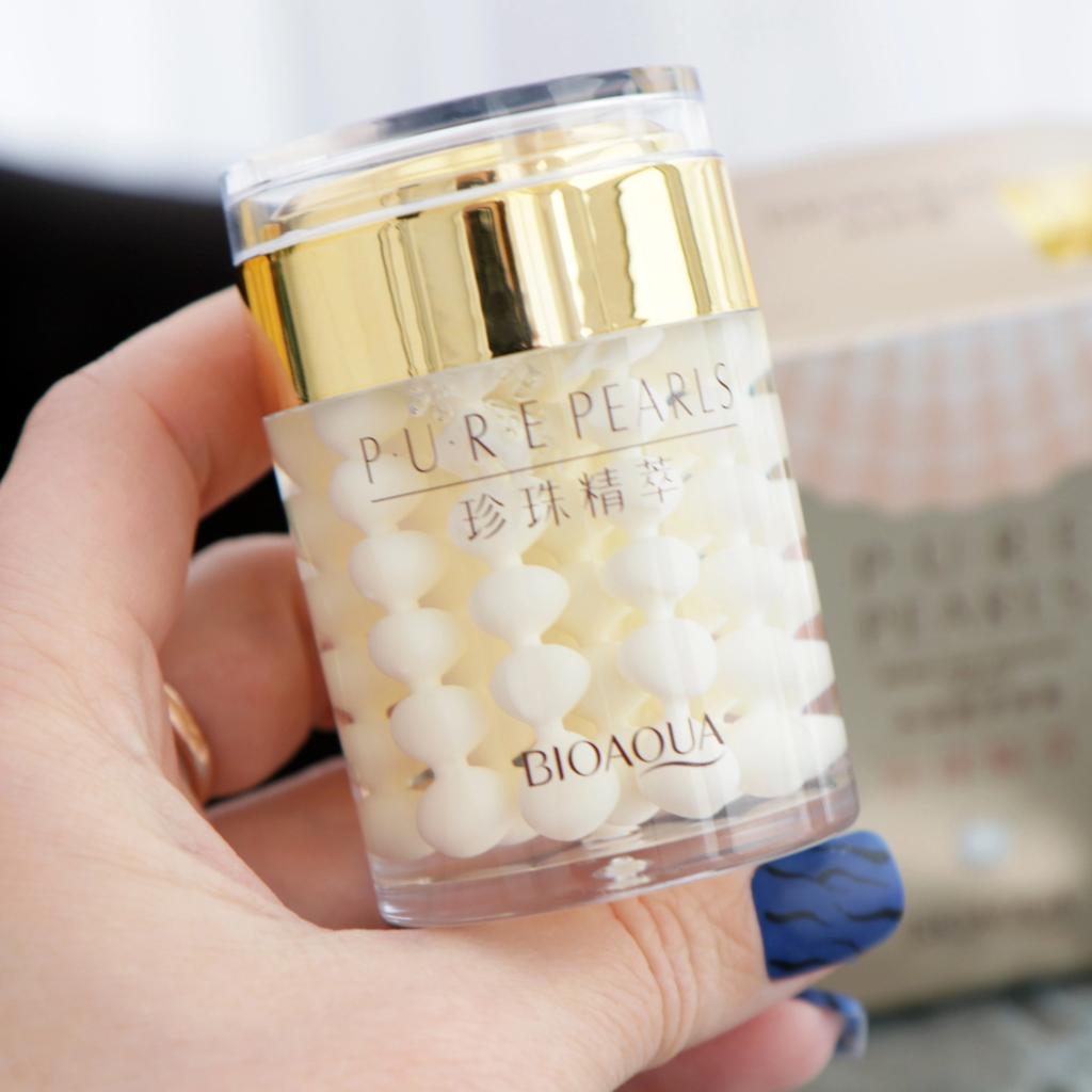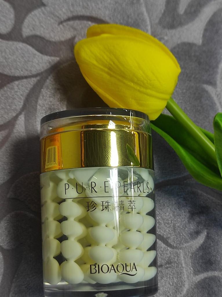 Крем для лица Bioaqua Pure Pearls Самая необычная подача крема, которую мне приходилось видеть. Крем пришел в золотистой коробочке обернутой в слюду, так же на коробочке была защитная наклейка от вскрытия. Внутри красивая пластиковая, прозрачная баночка оснащенная винтовой, золотой крышкой под которой находилась пластиковая мембрана. Крем стоял в коробочке плотно и был защищен пластиковой вставкой, поэтому в пути не пострадал, хоть коробочка была немного помята. Внутри так же находилась лопатка для зачерпывания крема. За счет прозрачной упаковки отлично проглядывается консистенция и структура крема. Ух какая же красота, небольшие округлые капсулки плавают в прозрачном желе. Крем имеет две фазы прозрачную, гелевую и необычные капсулки, бежевого цвета, имеющие в себе легкий перламутровый отблеск. Если смешать их обе, как в принципе и надо, то получается густая, бежевая, перламутровая, гелеобразная консистенция. Аромат приятный, пахнет крем какими-то духами, но не ярко и не навязчиво. На коже аромат практически не ощущается. Получается что-то среднее, достаточно питательное, хорошо увлажняющее, при этом быстро впитывающееся. По началу остаётся небольшая липкость именно от прозрачной части, но она проходит. Кожа становится мягчайшая, нежная и упругая словно изнутри. Ощущения очень приятные. Наносится и распределяется очень комфортно и без особых проблем. Я осталась кремом очень довольна👍🥰