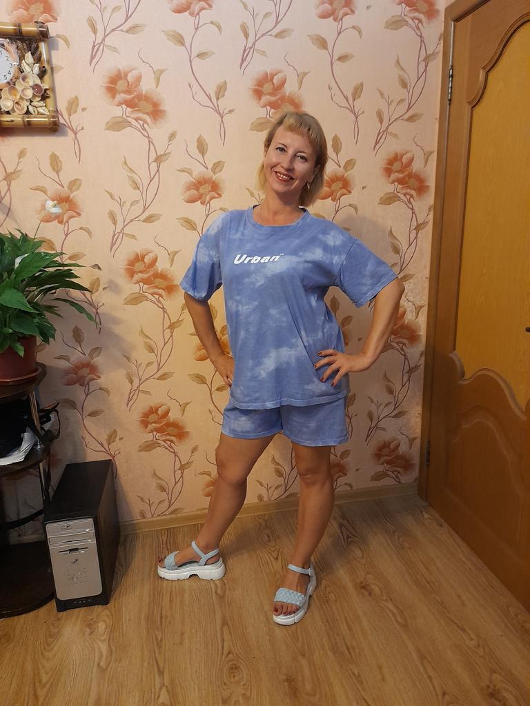 Летний костюм, в котором чувствуешь себя комфортно. В комплект входит:футболка и шорты. Футболка 👕 свободная, прямого кроя, удлинённая;рукава короткие, широкие;О-образный вырез горловины, принт в виде надписи. Шорты выше колена, но не короткие, широкая резинка на талии, два глубоких боковых кармана. Материал хлопок, плотный, мягкий, приятный к телу и на ощупь. Ткань не просвечивает, не электризуется, не сильно мнется, не тянется. Успела сильно испачкать, стирала в стиральной машине 🚗 в режиме"хлопок". Костюм не полинял,не сел,форма осталась та же.Гладится хорошо 👍. Цвет выбрала голубой,выглядит как на фото 📷 продавца. На параметры:ОГ 94,ОТ 75,ОБ 98,рост 1,65 я взяла L. Футболка 👕 мне свободная, как и задумано. Шорты нормально, но лучше бы я взяла XL. Качество хорошее 👍:швы ровные, аккуратные, нитки не торчат, запаха нет, дефектов не имеет. Костюм очень рекомендую, красивый,удобный, отличный вариант на лето.