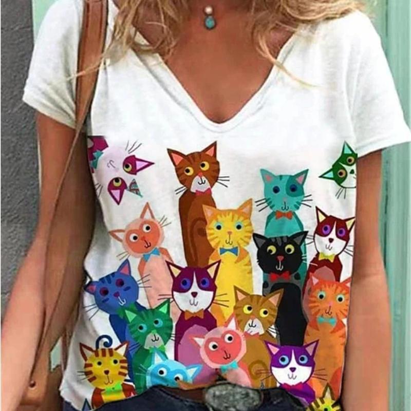 Женская футболка с рисунком кота, базовые топы с V-образным вырезом и геометрическим принтом кота — купить товар онлайн с бесплатной доставкой по всему миру!