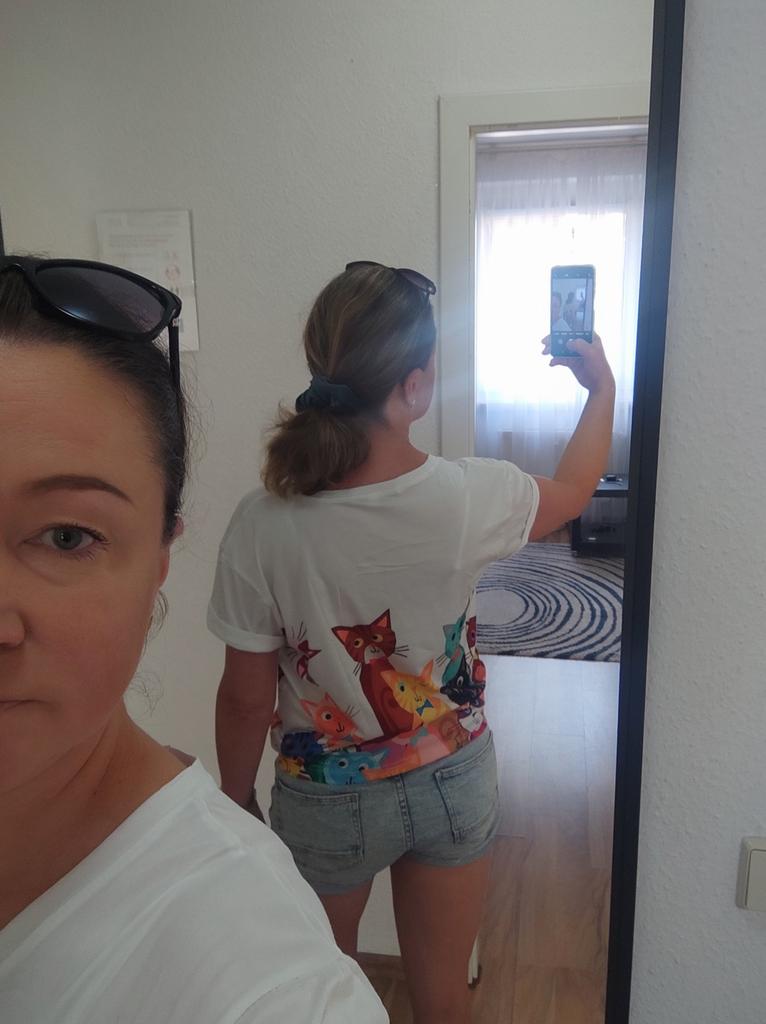 Футболка с кошками смешная, носить в быту, для прогулки во дворе классно! Тонкая ткань, думаю летом не будет жарко. Рисунок с двух сторон, пошита ровно, все края и рукава одинаковые, перекосов нет! Внешне все вроде отлично, но кое-где внутри торчат нитки, хотя мне настроение это не испортило. Глядя на этих кошечек, наоборот, настроение поднимается. Спасибо за выдумку и хорошую доставку!!!! 💞👍👍👍 Рекомендую.👍👍👍 P.S. Ношу 50, заказала L. В самый раз!