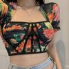 Женский тонкий топ с квадратным воротником и цветочным принтом, с открытым пупком и короткими рукавами