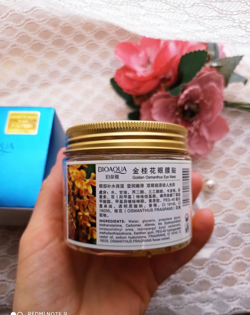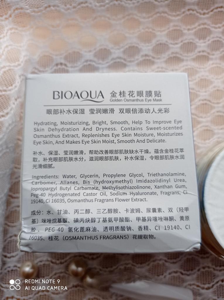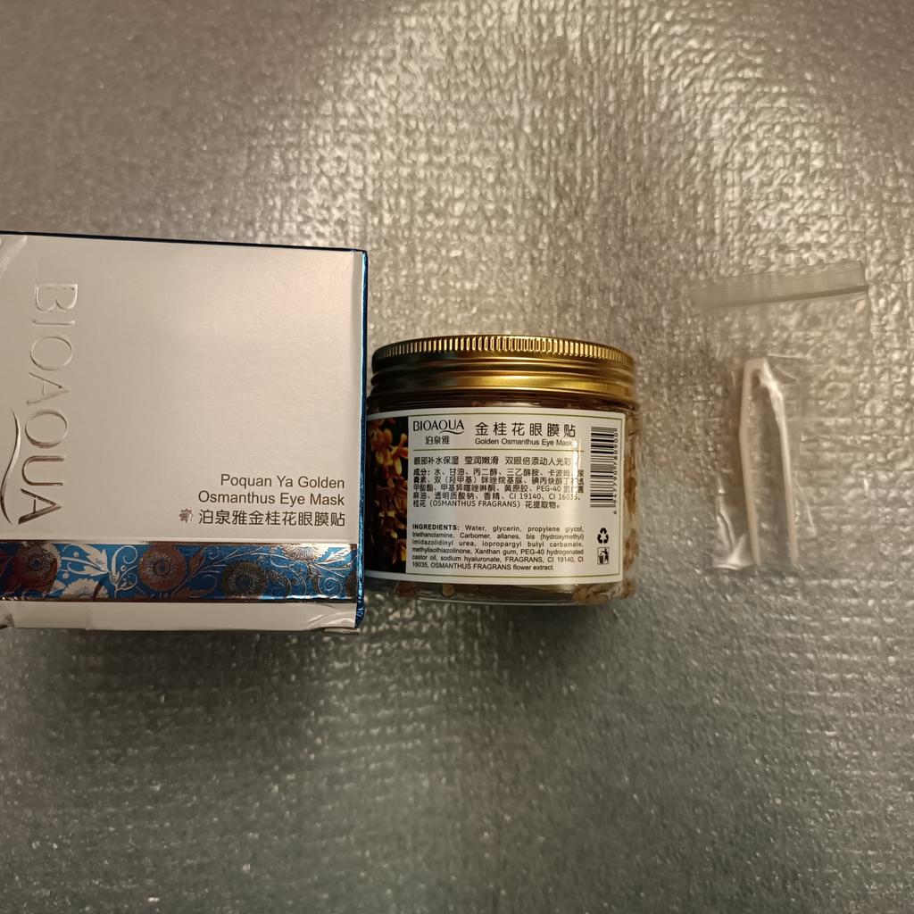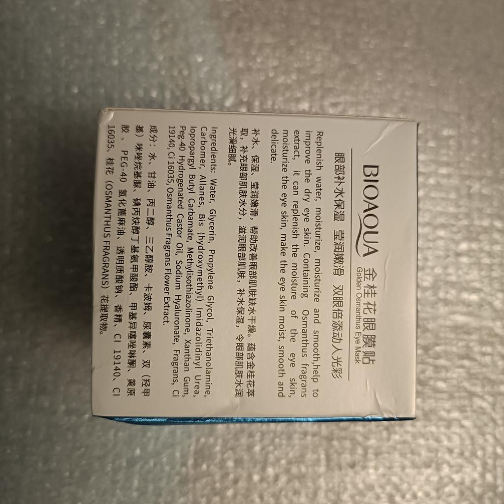 Коробочка немного помялась, но внутри не ничего не пострадало. Прилагаю перевод с коробочки. -------- BIOAQUA Маска для глаз с золотым османтусом Маска для глаз с золотым османтусом Увлажнение и увлажнение области вокруг глаз Восполняет воду, увлажняет, увлажняет и разглаживает, помогает улучшить сухость кожи вокруг глаз. Экстракт, он может пополнить влажность кожи глаз, увлажняют кожу глаз, делают кожу глаз влажной, гладкой и деликатный. Увлажняющий, увлажняющий, сияющий и гладкий, помогающий улучшить обезвоживание и сухость кожи вокруг глаз. Содержит экстракт золотого османтуса. Возьмите, восполните влажность кожи глаз, увлажните кожу глаз, пополните влагу, сделайте кожу глаз увлажненной Гладкая и нежная. Состав: вода, глицерин, пропиленгликоль, триэтаноламин, Карбомер, алланы, бис(гидроксиметил)имидазолидинилмочевина, лопропаргилбутилкарбамат, метилизотиазолинон, ксантановая камедь, Гидрогенизированное касторовое масло Peg-40, гиалуронат натрия, ароматизаторы, Ci 19140, CI 16035, экстракт цветков османтуса душистого. -------- Пока не пробовала, потом дополню) огромное спасибо продавцу 😃