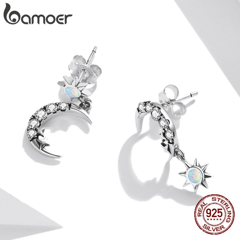BAMOER стерлингового серебра 925 пробы с кубическим цирконием 1 пара асимметричных блестящих сережек-гвоздиков со звездами и луной для женщин элегантные изящные ювелирные изделия — купить товар онлайн с бесплатной доставкой по всему миру!