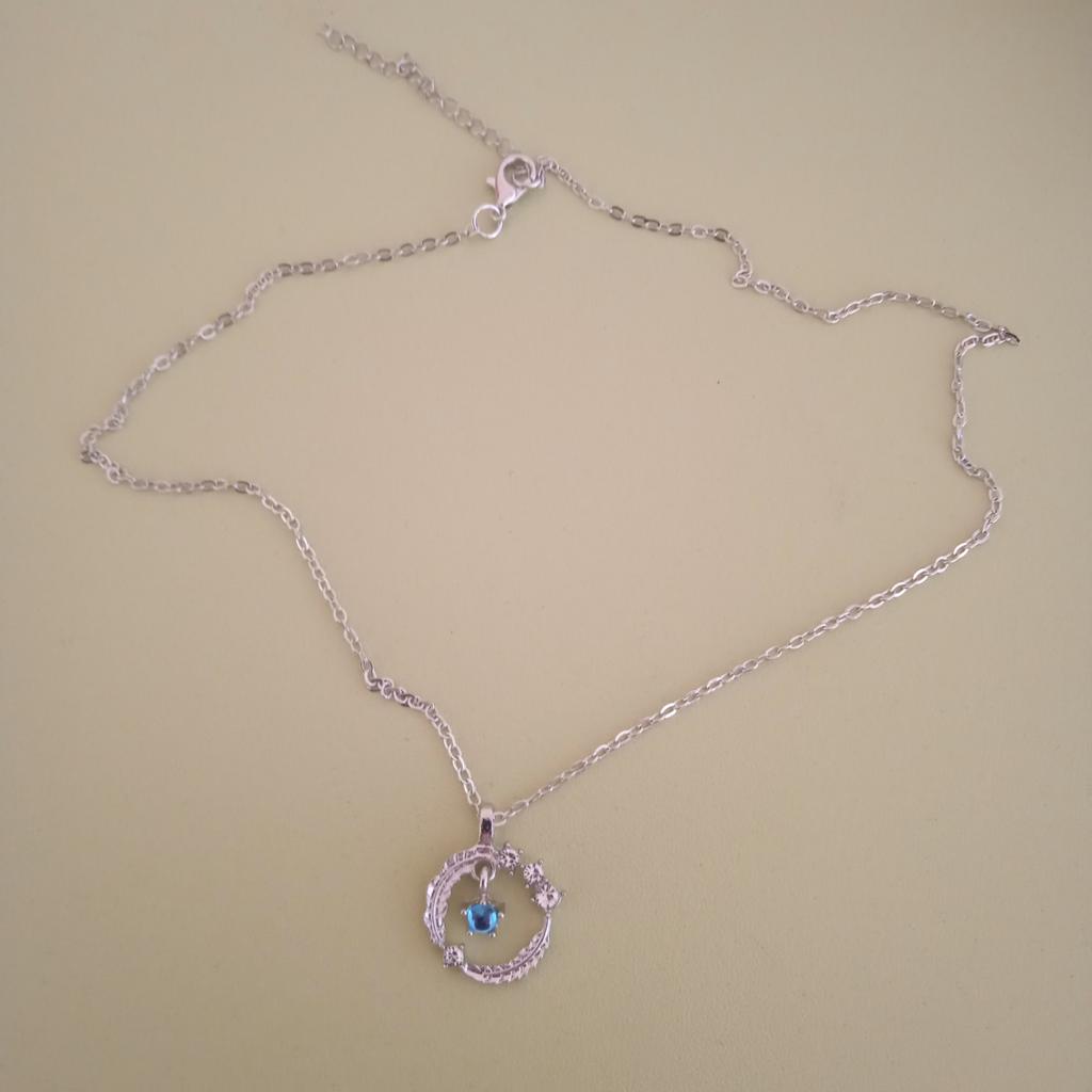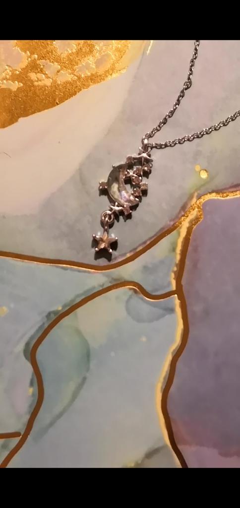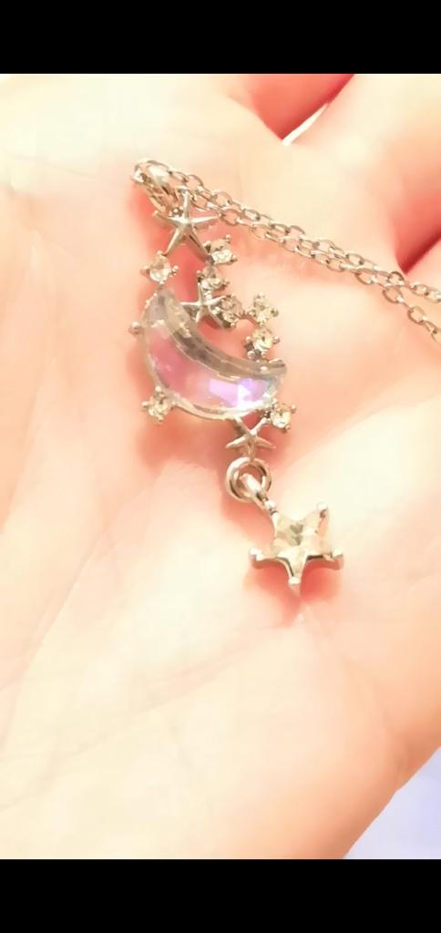 Подвеска безумно красивая 💞😍 но мне пришёл заводской брак... Застежка имеет слишком короткий "хвостик" и из-за этого этого образуется промежуток, в который цепочка выскакивает.... Увы... Сам камушек в виде месяца прозрачный, но удивительно нежно переливается сиреневым, розовым, голубым. Плюс звёздочки ввиде белых страз или стекла. Удивительно красивая, но брак... Придётся заменить заменить цепочку...