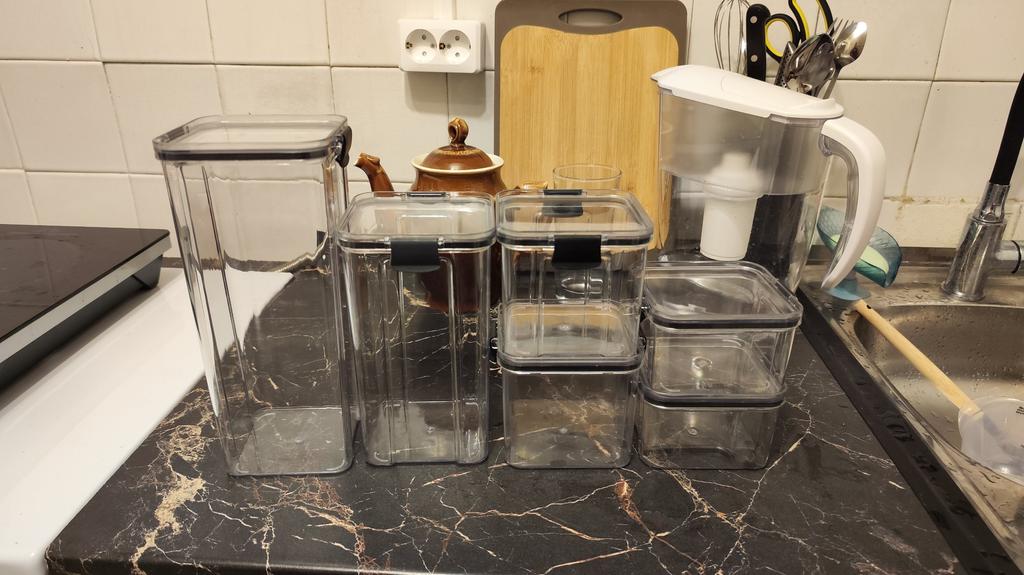 1800мл - для спагетти 1300мл - для макарон 700мл - для круп 460мл - для остатков, примерно пол пачки + по размеру идеально; функционально; друг на друге стоят хорошо - на одной крышке скол; крышки закрываются не так плотно как на контейнерах для еды, но случайно не отрываются (суп наливать не советую😅), для меня минусом не является, для их функции такая крышка подходит.