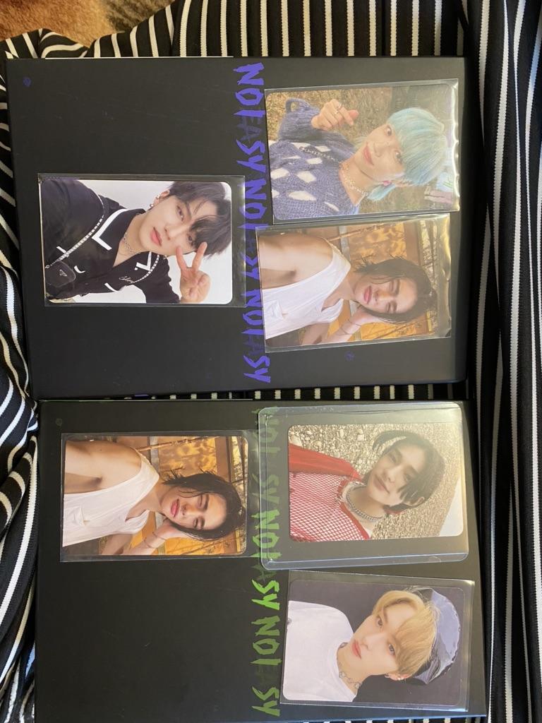 сначала, когда открыла первый альбом я была безумно счастлива, тк попался голубой Ликс, которого я очень хотела, потом вижу Хенджин, его я тоже очень хотела и прекрасная карта Бинни.💗💗💗 Открываю второй альбом и вижу что-то согнутое, мой мозг просто отказывался верить в происходящее. и вот, взяв в руки и разогнув, увидела карту Хенджина, у меня было несколько стадий: отвержение😖, истерика😫, злость😡 и после того, как поела, я приняла этот факт и решила, что жизнь продолжается, хоть и с трудом🙂 Потом решилась посмотреть остальные карты, и вот второй мой страх…повторка…три Хенджина. Даже не знаю благословение это или проклятье. Ну ладно, повторку я успешно продала и купила супер мега классную карту Чонина🫦🦊 И в общем я не знаю это передо мной так исправились или что, но я выиграла в лотерее карточку Джинни в шанель, которую ОЧЕНЬ хотела и вот скоро должна ее получить🥺 JYP огромное спасибо за потрепанные нервы!!! в общем да не распаковка была, а какие то американские горки.