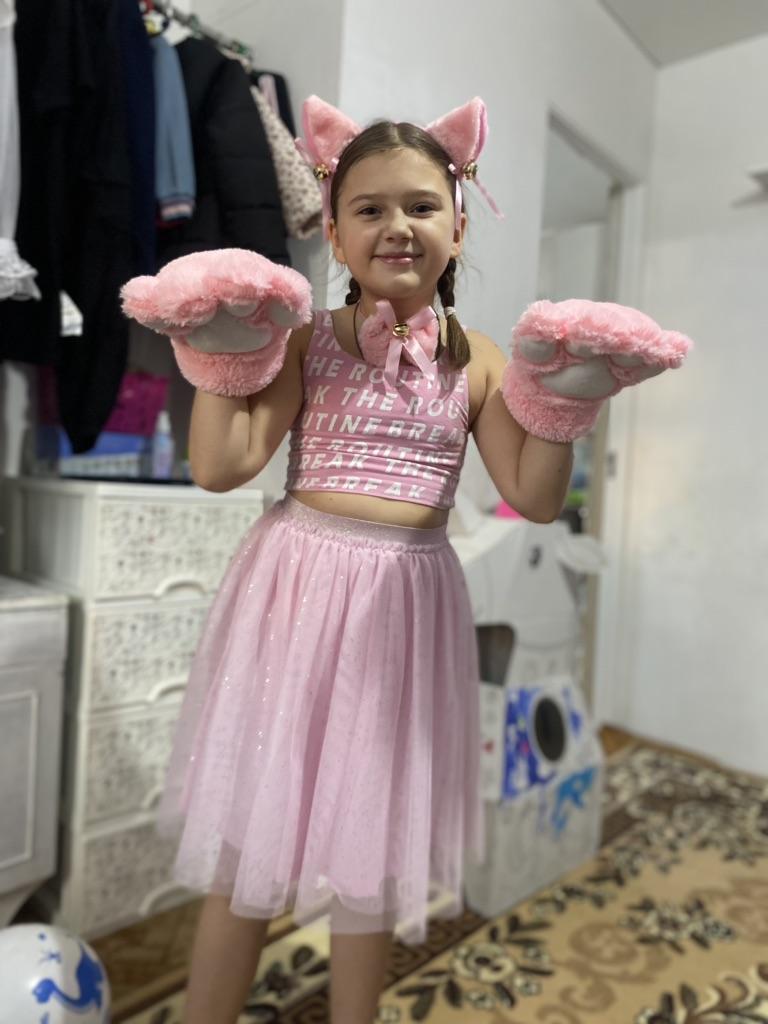 Костюм пришел быстро,около 2х недель ,Качество хорошее.Племянница 6 лет в восторге .Нюанс ,что хвост просто на булавке ,вокруг него можно завязать бантик ( входит в комплект). Перчатки- рукавички в виде кошачих лапок достаточно большие,моя рука легко помещается . Для праздника типа Helloween подойдет или на утренник в саду .