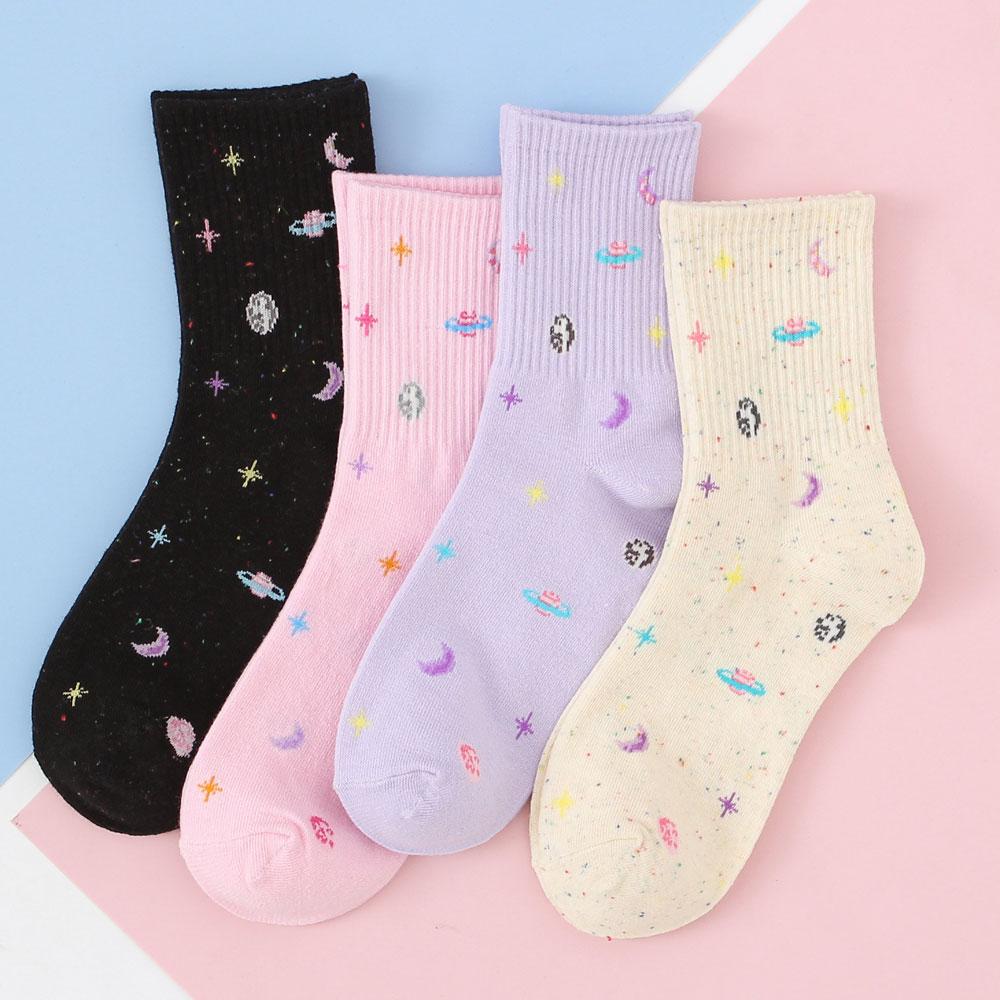 Женские носки, хлопковые короткие носки с планетой и космосом, милые короткие носки средней длины, розовые дизайнерские носки в стиле Харадзюку с луной и звездами, забавные носки