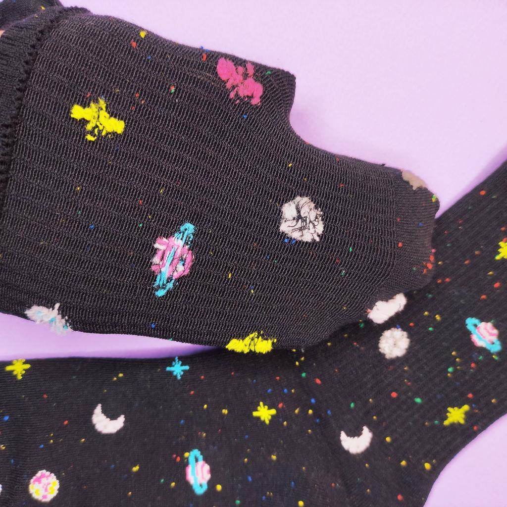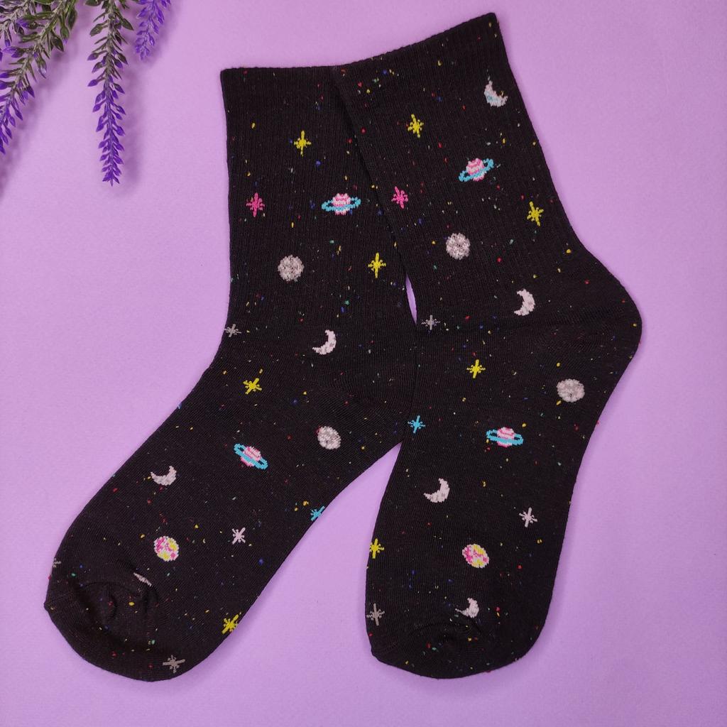 🌌 Носки космос 🌌 Ну очень красивые, не смогла пройти мимо. На черном фоне носков расположены яркие рисунки планет и звёзд. Рисунки прошиты, ниточки на обратной стороне практически не торчат. Носки высокие, с плотной резинкой. Подойдут на размер 35-40 .