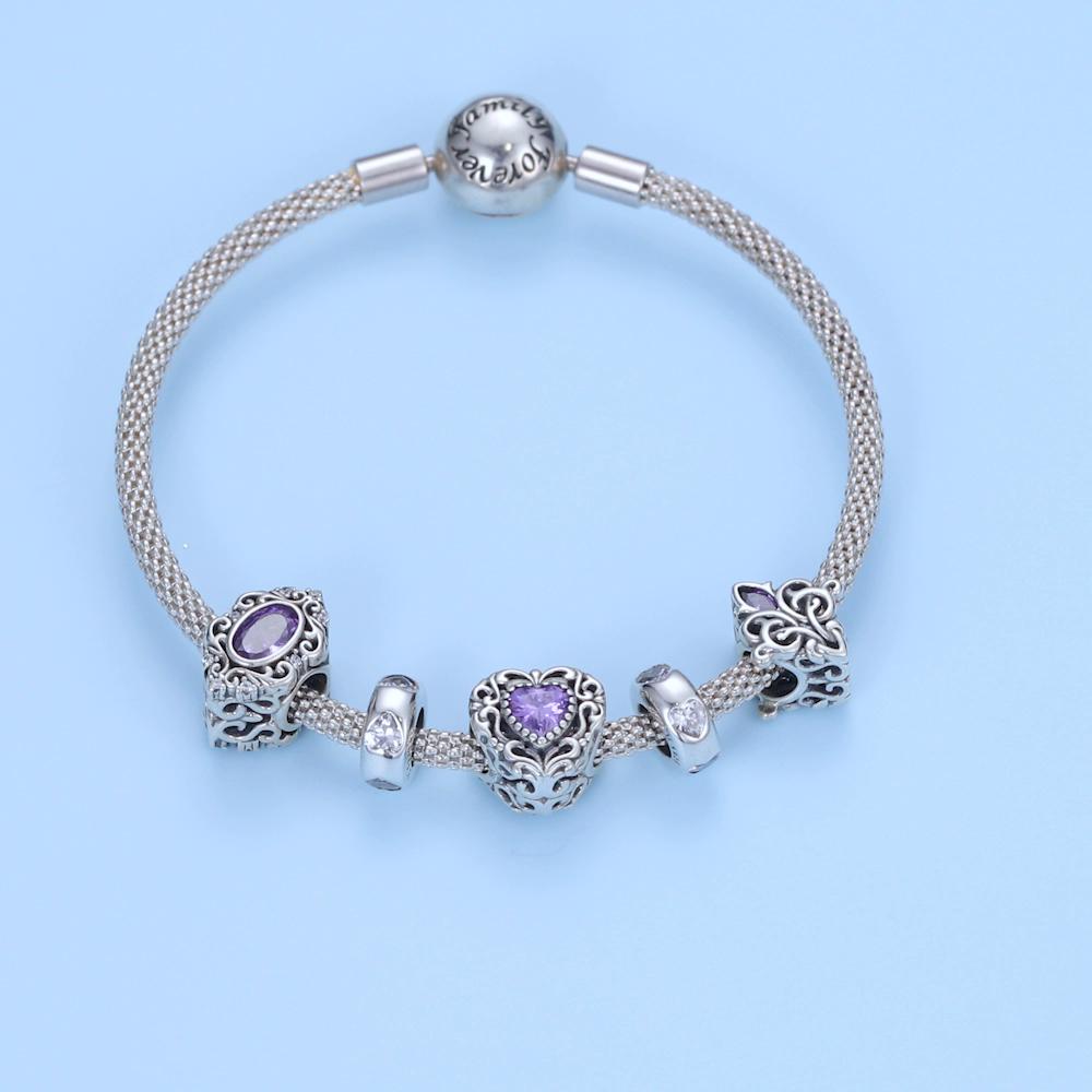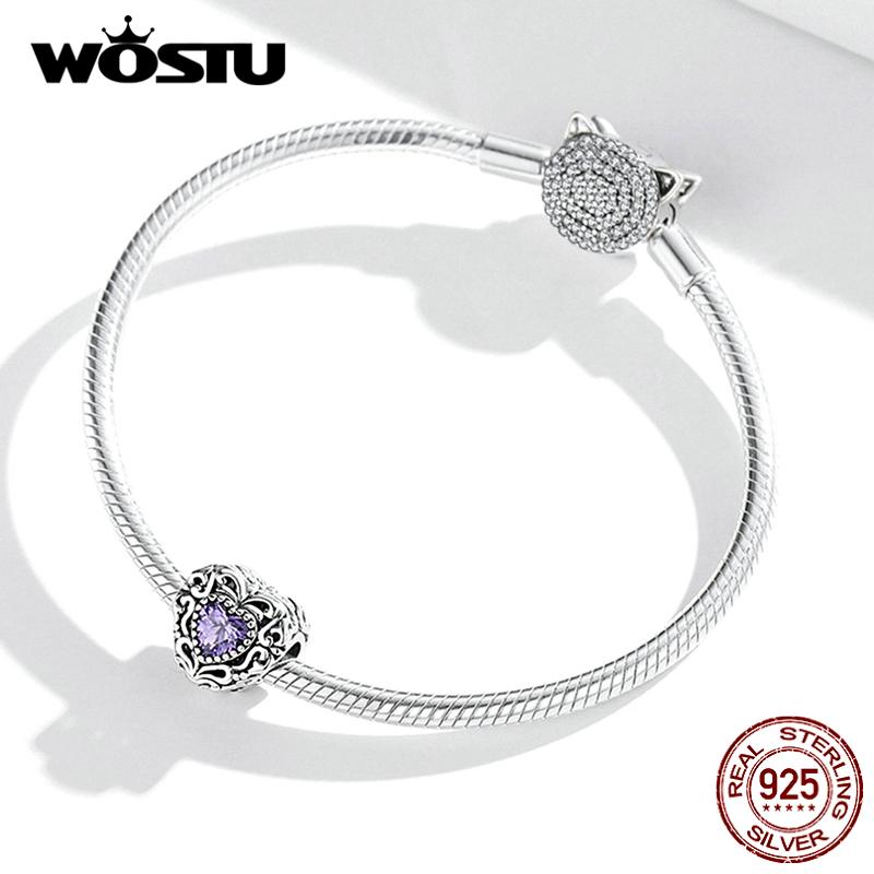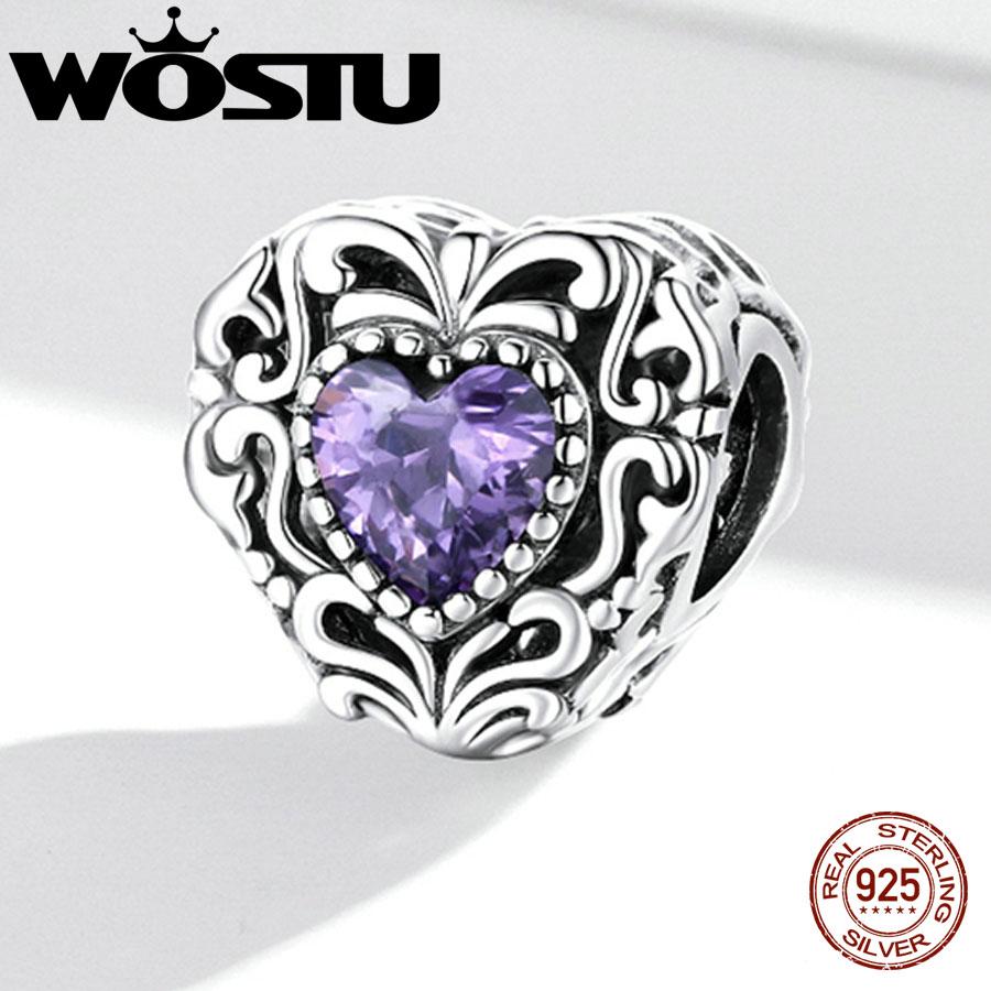 WOSTU Элегантный Ретро-узор Фиолетовый Циркон в форме сердца из стерлингового серебра 925 пробы, подвеска-бусина, подходит для оригинального браслета, DIY ювелирных украшений