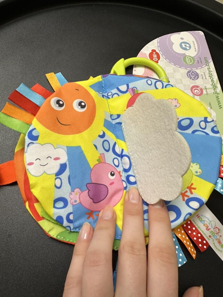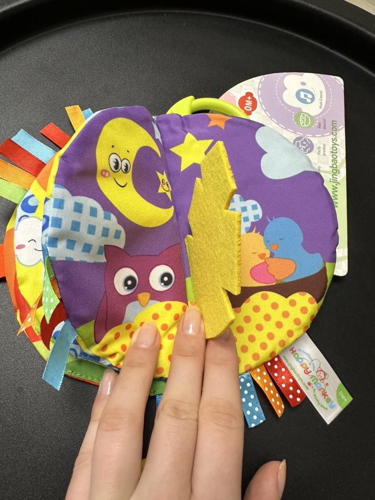 Посылка шла больше месяца в Самарскую область. Книжечкой заинтересовался малыш (4мес) и ребенку 4 лет тоже зашла 😅 каждая страница шуршит, есть пищалка, закрывается на липучку, грызунок. В общем хорошая такая игрушка. Зеркальца не хватает 🤗 была бы вообще класс!
