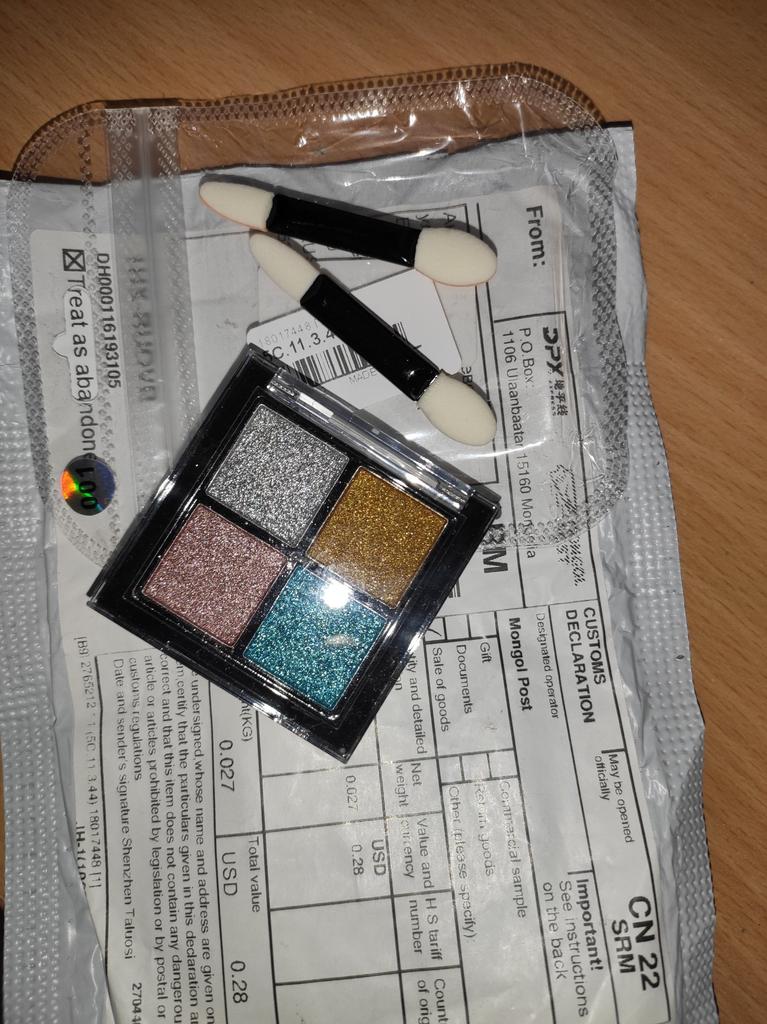 Описанию товар соответствует Выглядит очень круто, в деле еще не пробовала, отзыв дополню позже В комплекте 2 кисточки с разными концами (одна сторона пошире округлая, вторая — зауженная каплевидная) и кейс со втиркой Все пришло целое, но на кейсе есть незначительное количество блесток По объему сказать что-то сложно, размер упаковки на фото видно