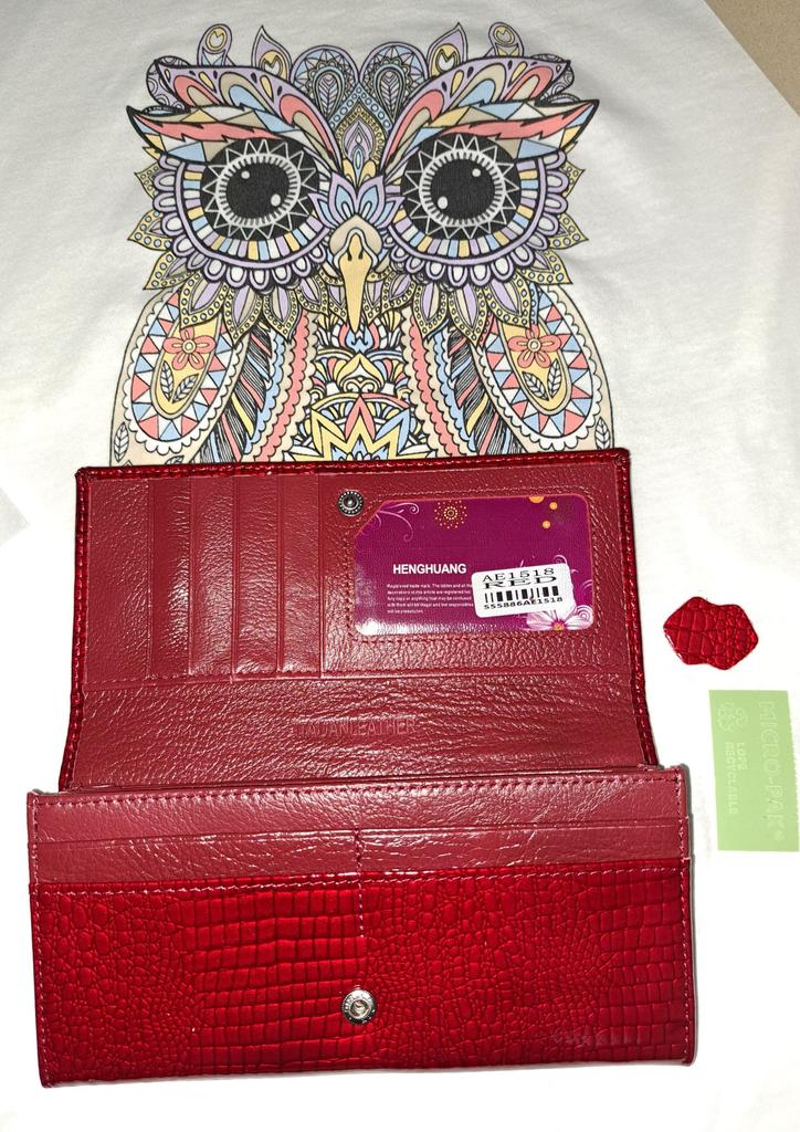 Отличный кошелек. Практически такой же, как мой старый. Застежка отличается и кармашков чуть меньше. Кнопочка отлично застегивается, замочки работают. Упаковано было отлично, ничего не повредилось. Правда запах от него резкий. Там вложен кусочек материала, надо проверить на качество. Позже отпишусь, кожа или нет. А так все отлично. Дополню. Это не натуральная кожа. Подожгла вложенный кусочек, он горел ярким пламенем ( натуральная кожа не горит, она плавится).