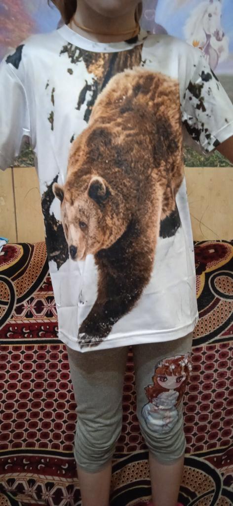 Отличная футболка.Качественно и нарядно смотрится.Медведь как живой, очень круто.Материал синтетика,в жару лучше не надевать.А так шито качественно.Продавца рекомендую.