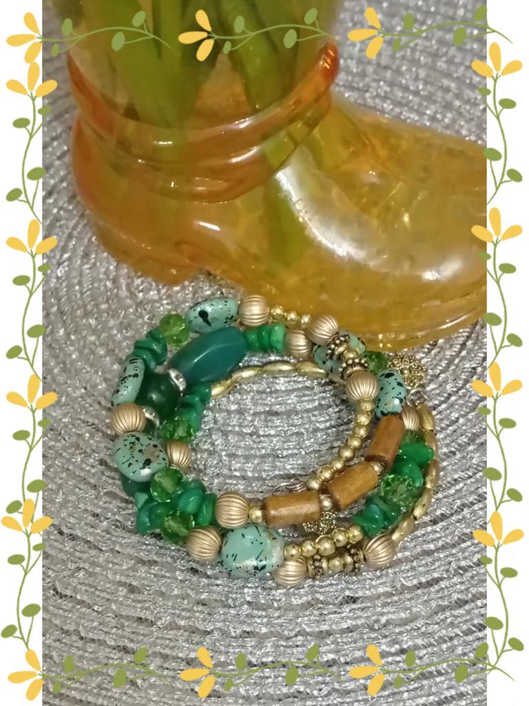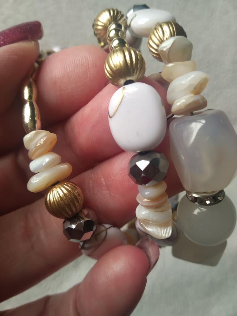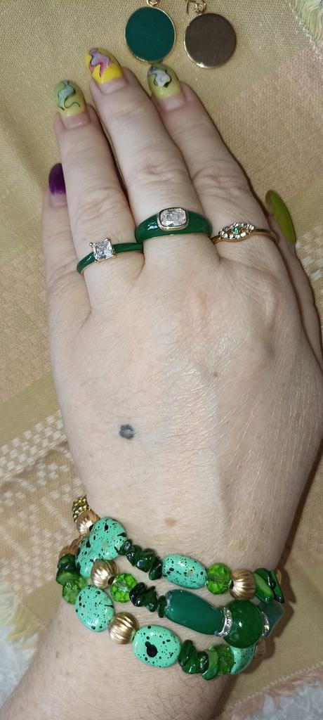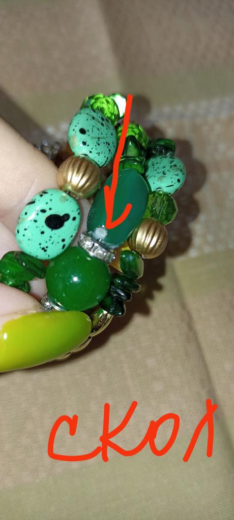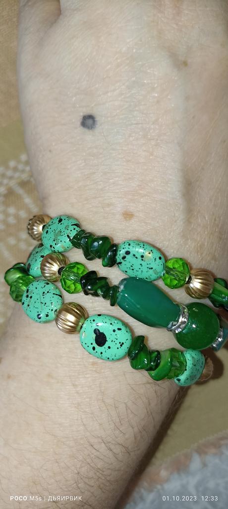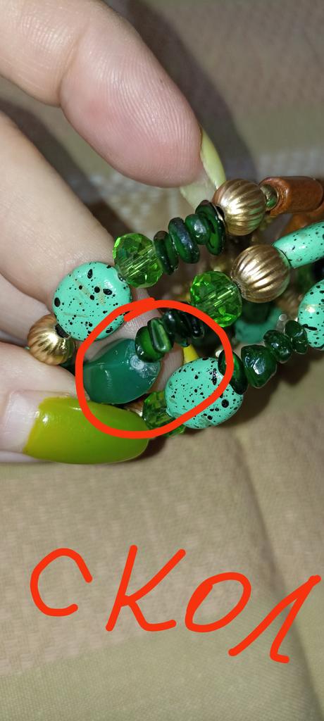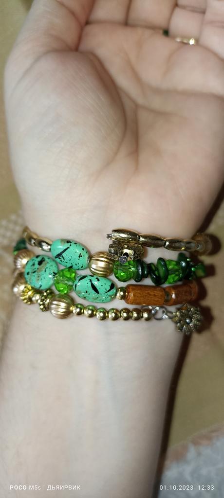 😉Всех приветствую! 👋 🟢Многослойный браслет! Бусины разного цвета и формы собраны на эластичную проволоку.В основном все бусины из пластика,но есть несколько стеклянных или натуральных ( точно не скажу) - эти бусины собраны в центре браслета. 🟢Браслет образует тройное обвитие,что очень эффектно смотрятся на вашем запястье. У меня запястье 16 см - браслет лёг,можно сказать,самый раз. ➖Длина всего браслета 65 см. ➖Ширина около 3 см. 🟢Я выбрала в зелено- золотистой гамме( она очень хорошо дружит с моими аксессуарами) Но у продавца есть и другие цветовые решения! ❗👆Есть нюанс о котором хочу рассказать: браслет пришел ко мне с браком - скорее всего пострадал при транспортировке. На стеклянных бусинах образовались сколы( см.фото) Спасибо большое С.П.брак полностью возместили👆❗ 🥰Желаю всем удачных покупок и теплых солнечных 🌞дней! 🛍️😍❤️
