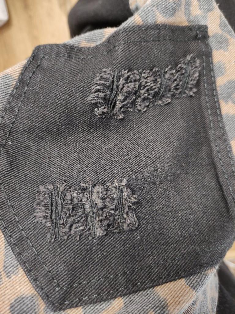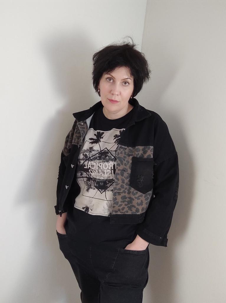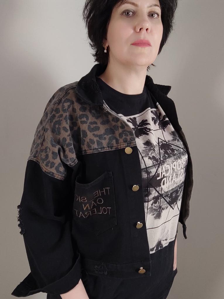 Хоть и написала, что куртка как раз, на самом деле- чуток великовата. Но я люблю свободные вещи, тем более, что под куртку нужно точно пододеть рубашку или майку . Куртка рассчитана на невысокую женщину, рукава впритык для моего роста ( до перехода в ладонь). На видео я рукава подвернула 2 раза, люблю рукав три четверти. Но для высоких женщин рукава куртки будут коротковаты, мой рост 158- 159. Да и длина курточки- тоже не на высокую даму... Много было ниточек, которые нужно было обрезать, не прорезаны под пуговицы петельки... В целом- впечатление хорошее. Рванина сделана аккуратно. Цвет куртки серо- черный, есть потертости. Вставки- коричневая ткань, вылинявшая с леопардовыми пятнами.Мои параметры106- 88-109, по параметрам можно было взять и размер М, но длина еще короче была бы- 55 см. Да и не люблю я носить вещи впритык. У размера xl- длина 56 см, хоть на см подлиннее. Поэтому ношу я такую коротенькую курточку с рубашкой, с удлиненным свитером, с длинной маечкой, чтобы прикрывать паховую зону... Всем моим знакомым понравилось, как сидит куртка на мне.