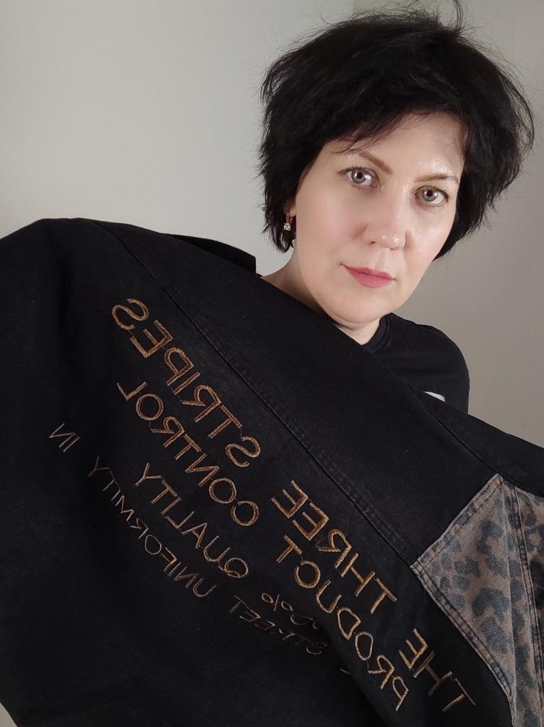 Курточка хороша! Потрясающая. Практически соответствует фото продавца за исключением того, что черный не седоватый, а именно черный. А так на все 1000 соответствия! Ткань чистый деним, без добавления стрейча, дырявенькая. Сезон, даже трудно сказать, мне на весь год нормально, я не воспринимаю ее как верхнюю одежду, но все же с мая по октябрь. С размерами угадала. Ог примерно 128 см Длина 52 см Плечо 28 см, рукав 40 см Ширина рукава 46 см. На мои параметры 105-87-105 с ростом 180 см. Петли не пробиты, но мне и в голову не придет ее застёгивать. Кое где торчат нитки, не критично, по желанию можно убрать. Рекомендую! Очень достойная стильная вещь несмотря на надпись на спине, уверяю, ее никто не заметит. Всем удачных покупок ♥️♥️♥️