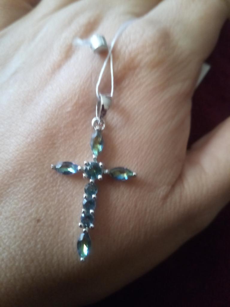 Крестик не большой аккуратный, смотрится дорого, переливается голубым, зеленым и фиолетовым цветом.