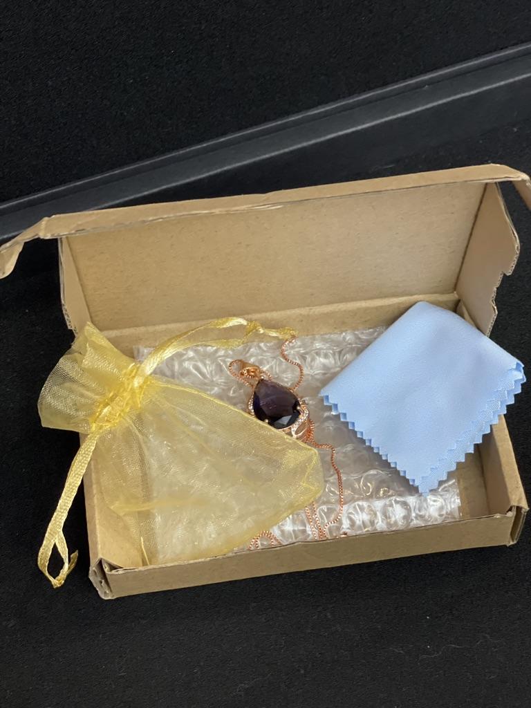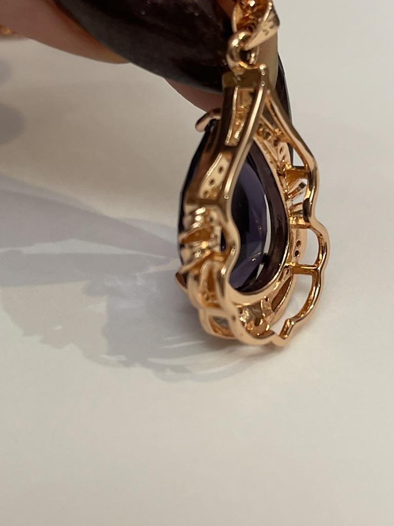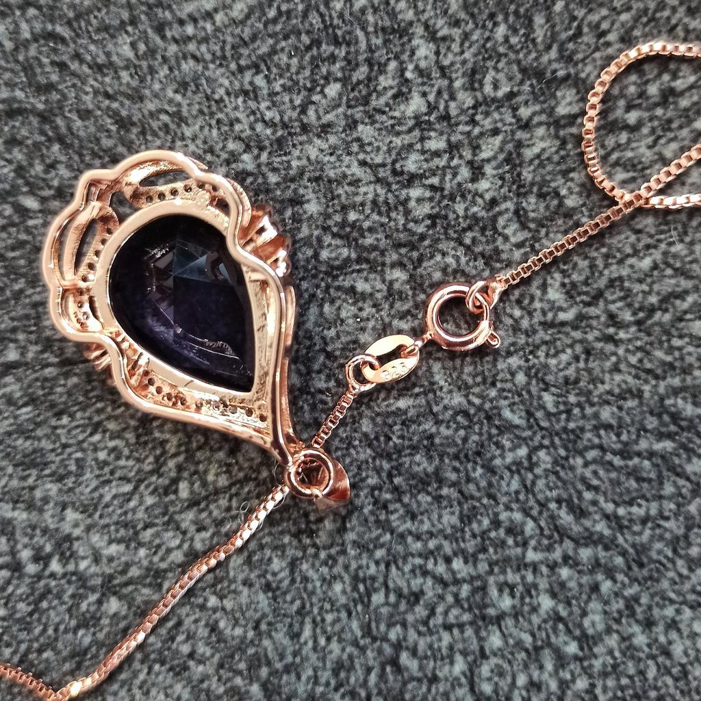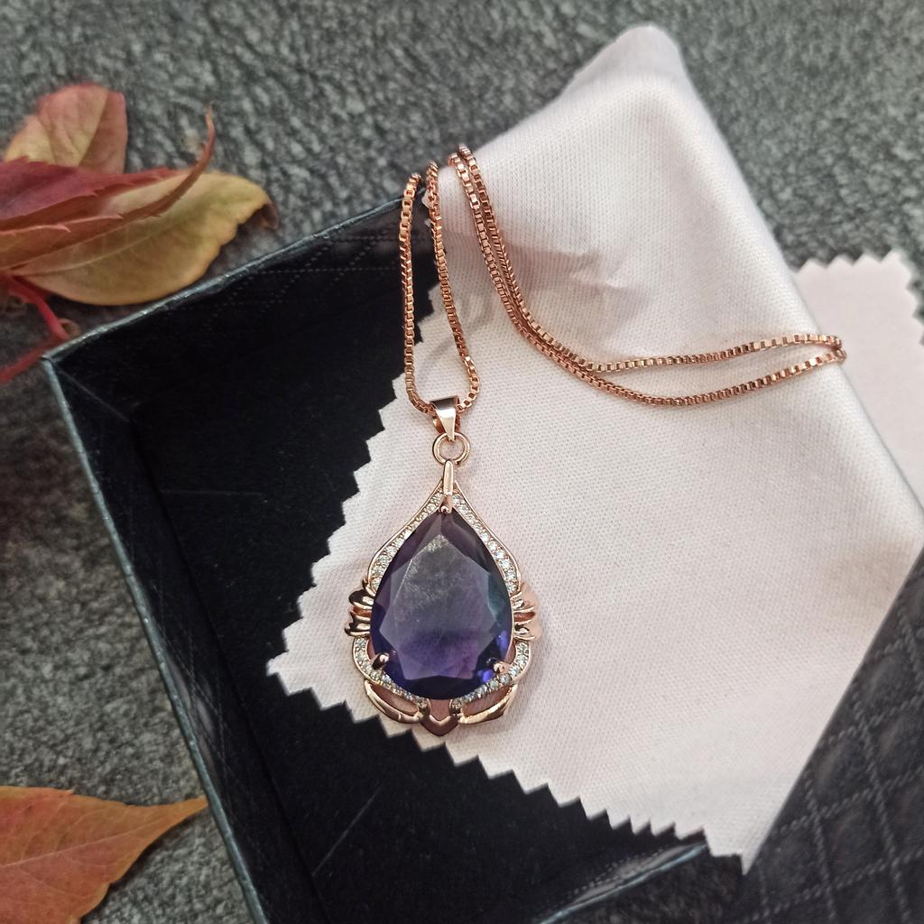 Красивая подвеска с цепочкой Lindon. Доставка заняла всего 18 дней до почтового отделения, принёс почтальон домой. Упаковка: подарочная коробочка, тряпочка для ухода за изделием и зиппер. Красиво объёмное плетение, размер цепочки регулируется дополнительной цепочкой, общая длина около 40+3 см. Подвеска крупная, с большим камнем тёмно-фиолетового цвета, красивый дизайн декорирован камнями, они на своих местах и хорошо закреплены, на солнце камни сверкают. Материал изготовления - сплав с покрытием цвета розового золота. Хотя на цепочке и на самой подвеске есть проба S925. Смотрится украшение красиво, мне очень нравится, хорошая цена, поэтому к покупке могу рекомендовать 👍