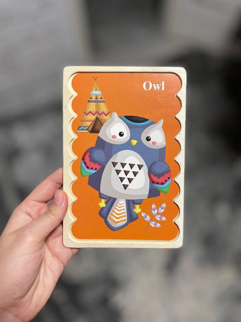 Детская деревянная игра. Мы заказали сову и оленя. Одна деревянная доска, восемь деревянных палочек с изображением на обоих сторонах (палочки достаточно толстые). На дне деревянной доски находится бумажный вкладыш с изображением оленя с одной стороны и совы с другой. Дочке 2 года, ей очень понравилось. Товаром довольна.