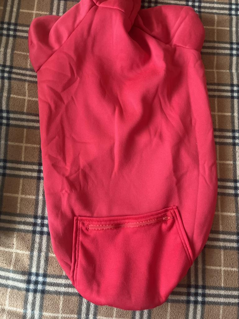 Размер не соответствует описанию. По ширине и длине меньше на 10 см. Собаке мало. Ткань неприятная синтетика. Есть у нас синтетические толстовки, они приятнее и плотнее. Карман супер.