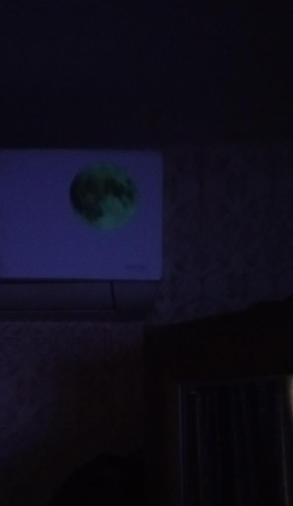 Просто вау… Почитала отзывы и думала что Луна будет совсем неяркой, а а самом деле она настолько ярко светится, что вполне может заменить ночник. Правда свечения хватает на небольшой промежуток времени. По сравнению с луной-наклейкой звездочки держат светимость намного дольше ( Пришла посылка немного мятой, это видно на фото; клейкая сторона очень крепкая, поэтому клейте осторожно