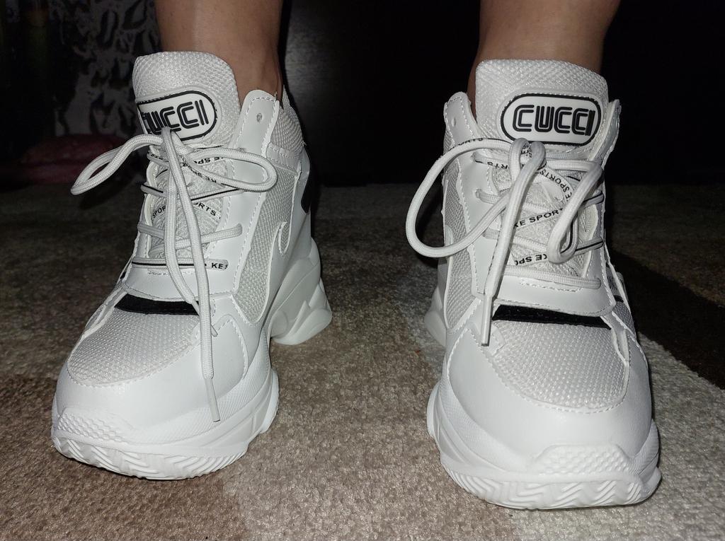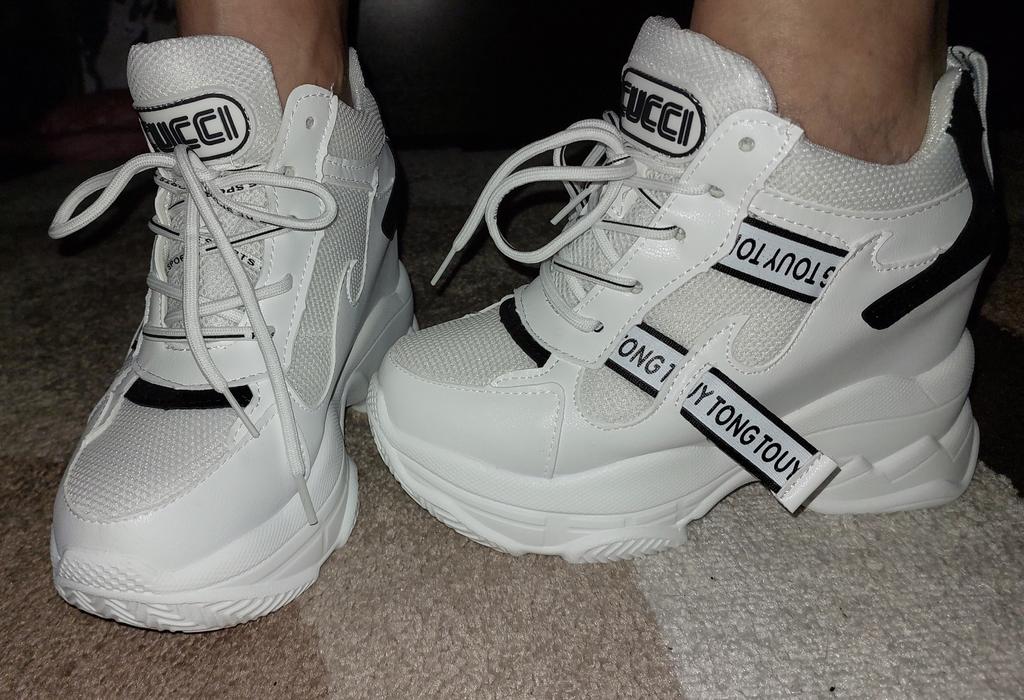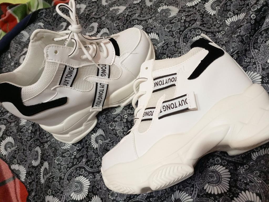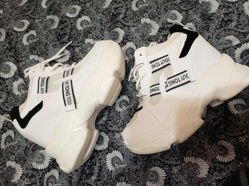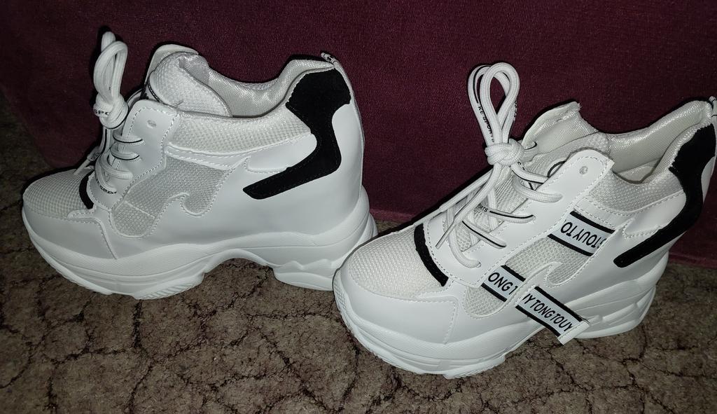Кроссовки неплохие, смотрятся на ножке очень мило, надо привыкнуть, платформа высокая, ношу 36,брала 37,на размер больше, но надо было 38,чуть палец большой упирается, чуть пружинят, есть небольшой запах краски