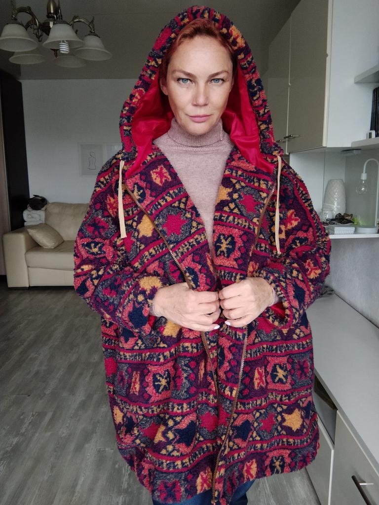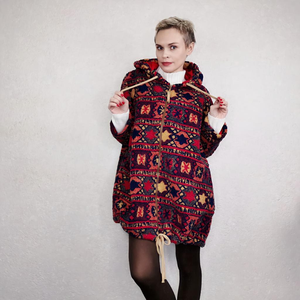 Шубка из флока в яркой, этнической расцветке. Большая, объемная, супер- мега оверсайз. Я взяла размер 2xl, чтобы было максимально свободно. Верхний материал флок, точно такой же, какой используют при пошиве шубок и пальто teddy Bear- культовая одежда). Преимущество этого материала в том, что он априори уже слегка свалялся, то есть во время длительной эксплуатации уже больше чем есть, не сваляется). У меня есть пальто в этом стиле, ему уже лет 5, и оно до сих пор не потеряло первоначальный вид. Капюшон большой, роскошный. Контрастная красная подкладка. Есть карманы. Застёжка молния. Низ пальто можно затянуть шнурком, тогда пальто приобретет форму кокона. Края шнурков в капюшоне и внизу не обработаны, но шнурок не сыпется. Я завязала узелки. Размер полностью соответствует сетке продавца. Пальто, или куртка ) очень большое, и подойдёт, думаю, до размера 56 точно. Мой рост 167, параметры 98-87-101. Качество пошива фабричное, есть бирки и этикетки. На выбор 2 цвета, есть ещё более яркий, чем мой. Довольна очень. Рекомендую!