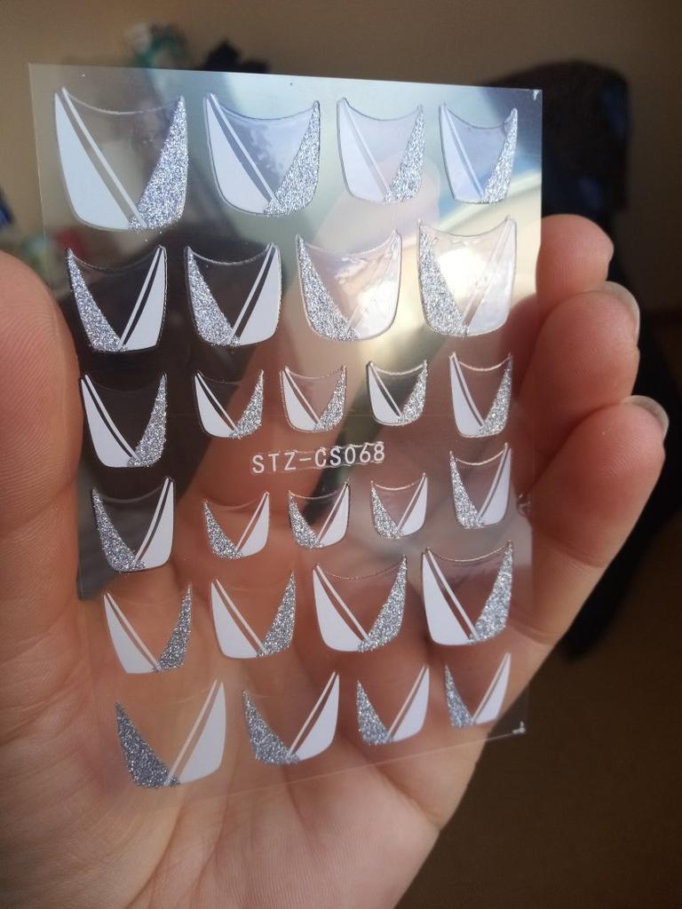 Наклеечки супер 👍😍👍. Очень понравились. На плёнку приклеены, как будто выпуклые. Блесточки шелушатся, поверхность шершавая. Точно как на картинке. Количество не считала. Размеры разные, думаю подберу ко всем ногтям. В салонах такой фрэнч нарисовать стоит дороговато, а я за копейки свои ноготочки украшу такой красотой😍😍😍. Спасибо большое продавцу, я очень довольна 👍😉