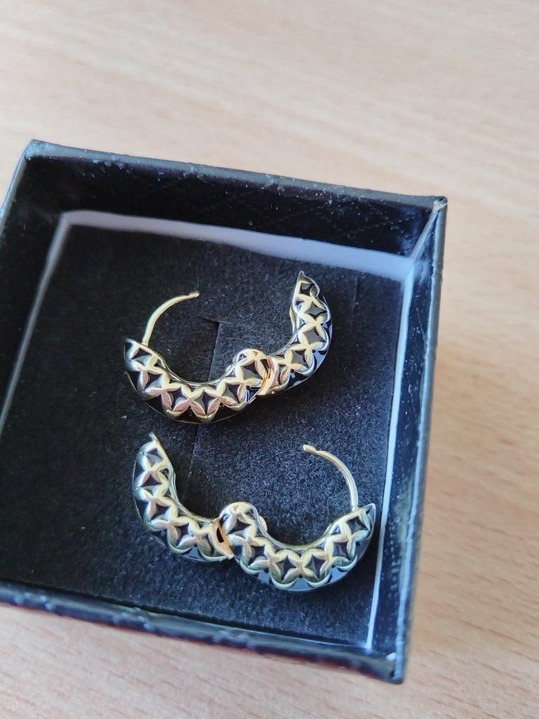 Серьги пришли в тоненьком пакете, застежка была погнута, "позолота" стерлась на месте изгиба. Но в целом серьги выглядят очень достойно. Советую продавцу лучше упаковывать и тогда было бы 5 звезд.