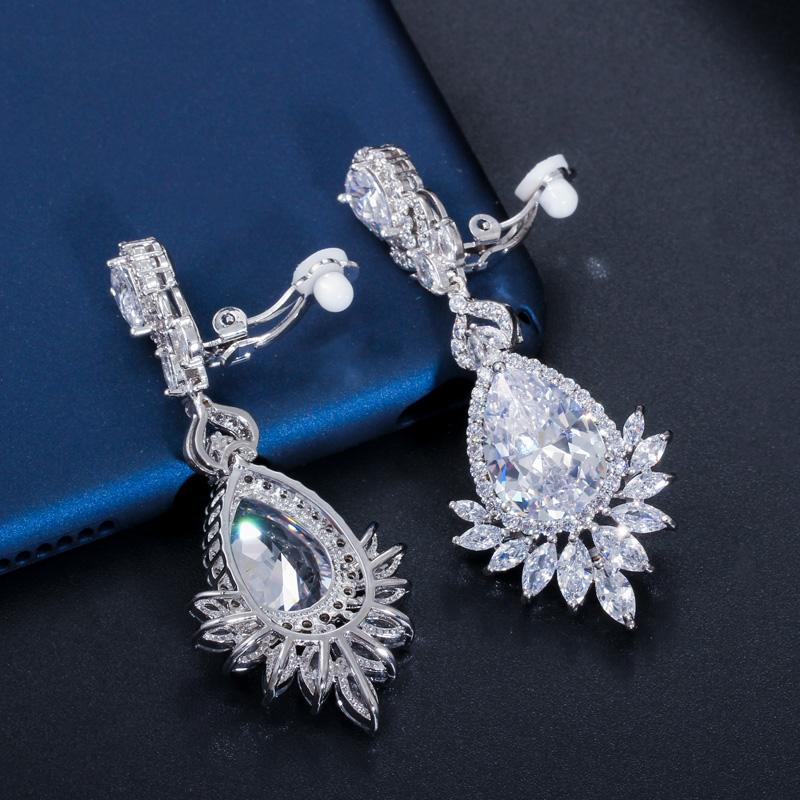 Серьги-клипсы с цирконием CMM серебряного цвета в форме груши без проколов для невест