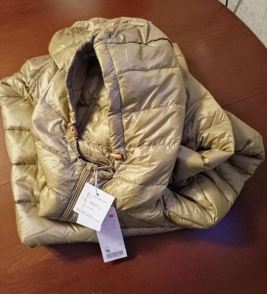 Ещё одна лёгкая куртка-пуховичок. Эту заказывала для себя, специально размером побольше, что бы получился оверсайз. Поскольку, у меня рост высокий, мне куртка доходит до бедер. Рукава по длине только-только, но у меня не только рост высокий, но и руки длинные, пропорционально росту. Женщинам среднего роста и куртка будет удлиненной, и рукава будут по длине нормальными. Что бы куртка была комфортнее, очевидно, я поставлю трикотажные манжеты, и сделаю по низу куртки стяжку-шнурок со стопорами. Эти куртки могут быть немного разными по деталям. Предыдущая куртка, которую я заказывала для мамы, темно-серого цвета и у той куртки отстёгивается капюшон и вход в наружный карман на молнии. У других курток, насколько я успела заметить, посмотрев отзывы и фото к ним, может отличаться частота стежки, могут быть карманы без молний и капюшон не всегда отстёгивается. У моей куртки (цвета шампанского) карманы без молнии, и капюшон цельнокроеный с воротником. Мне бы, конечно было бы удобнее, если бы капюшон отстёгивался, но не критично. Мои параметры: рост 180 см, Ог - 108 см, Об - 118 см. Фактические измерения куртки Ог - 138 см, Об - 150 см, длина - 82 см, ширина плеч - 47 см. (У продавца для размера 7XL должны быть измерения ОГ - 132 см, длина 86 см, ширина плеч 46 см. Как видно размер, пожалуй, не 7XL а все 8 XL. Куртка большемерит, и чуть короче заявленного, но, учитывая, мой высокий рост, и то, что я и хотела оверсайз, так же лёгкость и пластичность самой куртки, и ещё с учётом будущих трикотажных манжет и шнурка-стяжки по низу, общий вид куртки после некоторой доработки будет в самый раз - не обтягивающей гусеничкой, а достаточно свободным бомбером. Придираться к размеру не буду, возможно производитель отмаркировал размер на глазок - для подобной куртки некоторый свободный объем - благо. Можно будет и с тонкой водолазкой, и со свитером потолще надеть и не страдать, что в куртке тесно. Из плюсов куртки - очень красивый цвет и застёжка - молния с двумя бегунками - будет удобно садиться и расстёгивать молнию снизу. В общем, приятная куртка, вполне прилично отшита, каких-то сильных косяков не обнаружила. Традиционно у всех этих курток комплекте есть мешочек, куда можно убрать куртку при транспортировке или хранении. Продавец положил красный шнурок в подарок - второй раз спасибо от моей кото-банды, шнурок сразу же был унесен для игр. Посылка с курткой добралась довольно быстро - ехала чуть больше трёх недель. Продавцу и Джум спасибо. Я вполне довольна, куртку рекомендую - в силу своей лаконичности дизайна, это такая, можно сказать, базовая вещь, если правильно подобрать размер