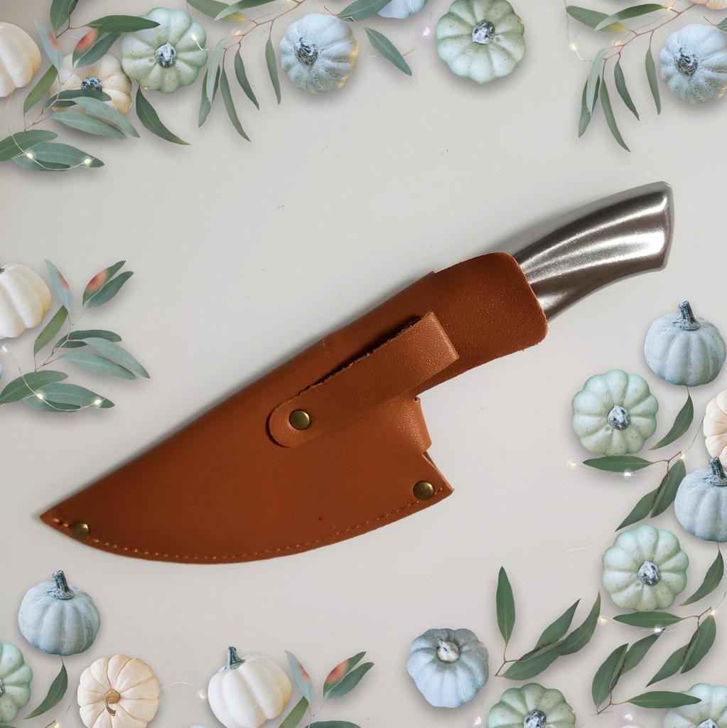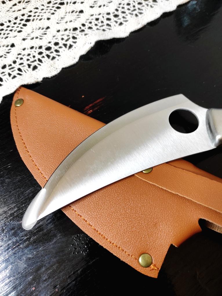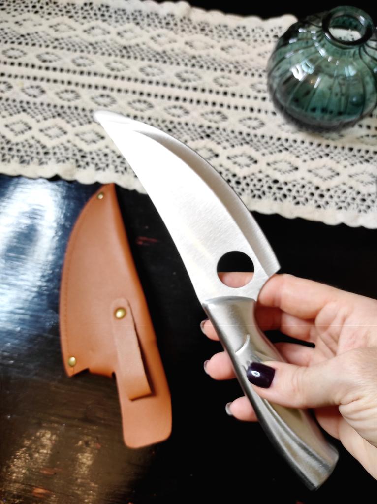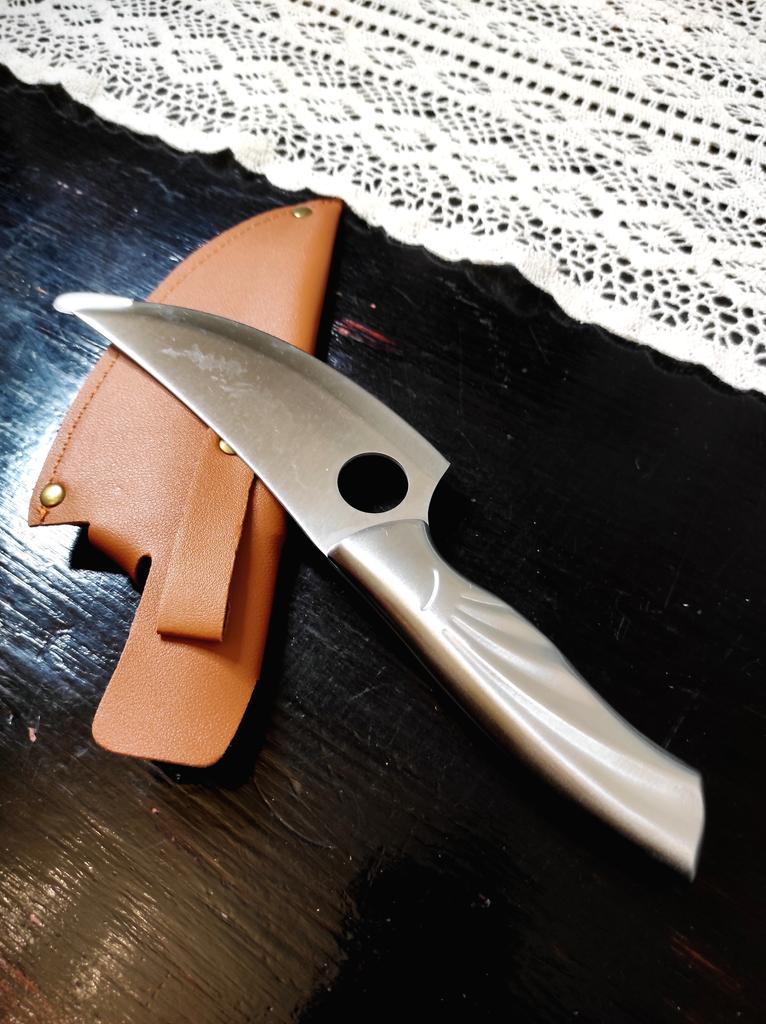 Универсальный нож Для чего угодно, хоть мясо, хоть рыба, хоть овощи. Стальной полностью. Вместе с ручкой. Ручка внутри полая, конечно, иначе бы ножик был чересчур тяжёлый. Лезвие широкое. Есть отверстие для пальца. В руке лежит удобно. Острейший. Есть пластиковые заглушки, чтобы не прорезать чехол. А без чехла никак, хранить голым опасно, очень острый. Отличный. Присмотритесь.