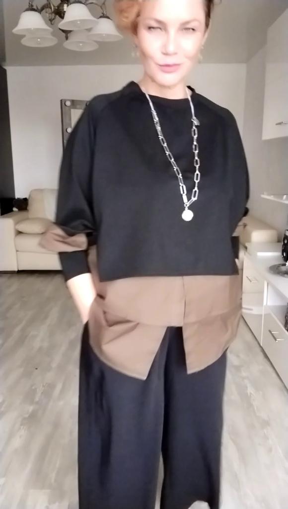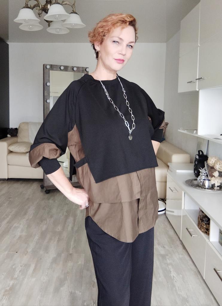 Dimanaf шикарная кофта на все случаи жизни! Ни за что не догадалась бы, как она сшита, пока не увидела. Вы когда нибудь слышали слово "кадавр"? Это когда два или более предмета одежды сшиты как одна. И в нашем случае - это цельная, интересная вещь. И как приятно, что это не "молодёжка"! На первый взгляд мрачновато, но я ошибалась. Ничуть не жалею о приобретении, вещь отличная! Верх плотный трикотаж, тянется плохо , немного глянцевый, низ - толстая рубаха. Мне тесновато в плечах, я хорошо показываю на видео, что у модели несмотря на приличный запас по ширине, есть ограниченный резерв в росте, жаль, уверена, что продавец это прочтет, и постарается исправить ситуацию. К тому же одним XL ограничиваться не стоит, модель классно сыграет и в большем размере! Замеры: ОГ 126 см Длина изделия 75-76 см Рукав - реглан, меряю от горловины 67 см Рукав в широком месте 48 см, в узком на манжете всего 20 см, подтянется ещё чуть-чуть. Мои параметры: 105-87-105 при росте 180 см. Слабое место именно манжета, и ее не разрезать если что: утратится концепция модели. Поэтому совет - рост до 170 см. Или если выше, то на совсем худышечку. Модель очень классная, необычная! Рекомендую 💯🤩 Всем удачных покупок ♥️♥️♥️