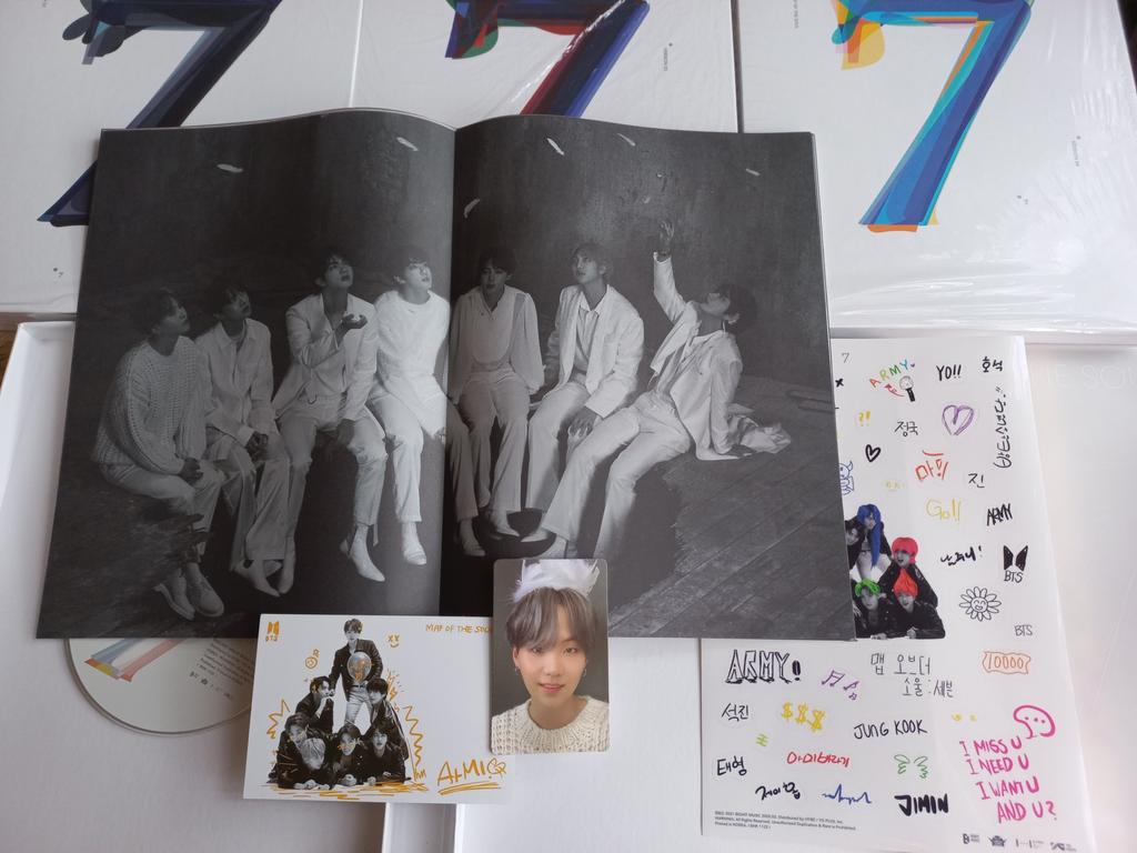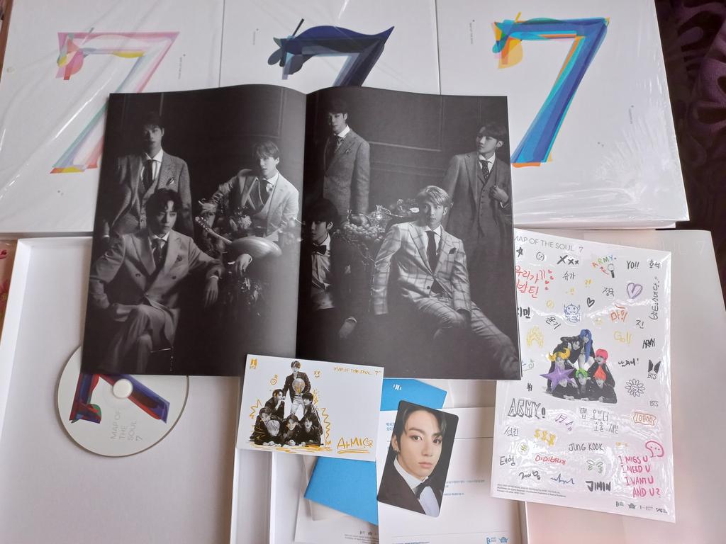 Заказ делался сетом 21.08, получила 22.09. Упаковано очень хорошо, в несколько слоев пупырчатой пленки. Альбомы повреждений не имеют. Альбомами довольна. Положили два набора подарочных карточек. Один набор повторок нет. А во втором повторки: 1- Намджун, 2- Хосока, 2- Чонгука, 3- Техена. Конверт от одного набора карточек прикольный, мне понравился. Меня это позабавило. Наклейкам применение нашлось. Все классно!!!