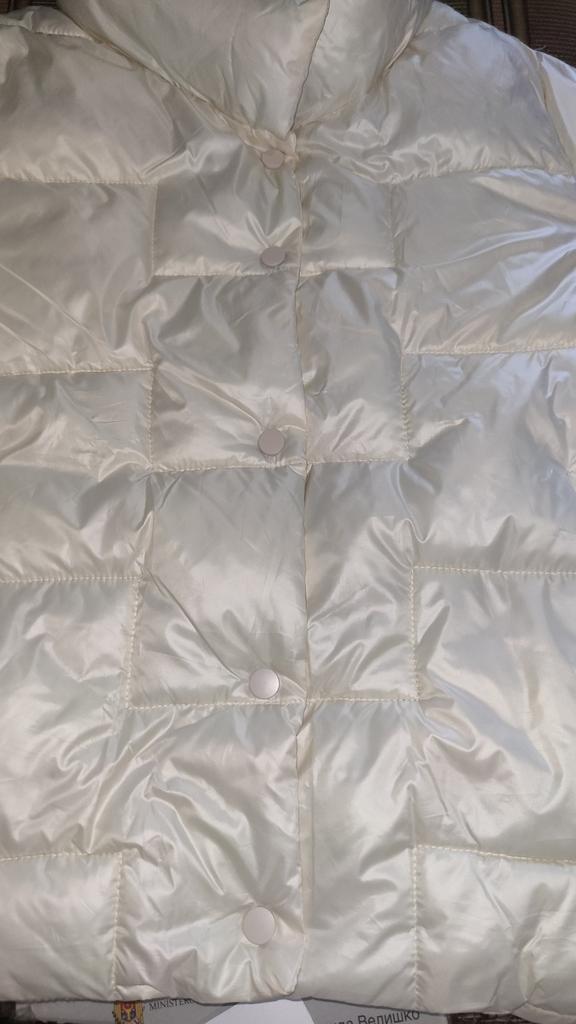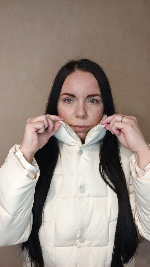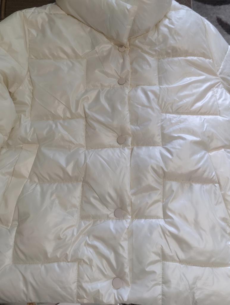 Получила я курточку. Цвет не белый, а цвет шампанского. Думала, она будет матовая. Но нет, ткань блестит, но от этого куртка даже лучше смотрится. Внутренний наполнитель - синтепон. Куртка легкая, невесомая. Карманы глубокие. На счет размера. Мне она впритык в груди и рукава только-только (надо вшить манжет). Мой ОГ 100см. Но за счет того, что фасон типа баллоном идет, то сзади на спине куртка не в натяг. Во время движения рук, сзади не тянет. Я не хотела оверсайз, поэтому брала чуть с запасом. На тонкий свитер - хорошо. Вчера у нас утром было +4, мне было комфортно в ней. Длина куртки чуть ниже поясницы. Но я так и хотела. Теперь замеры куртки: ОГ 106 ОТ 106 Обхват по нижнему краю 102 Плечи 41 Длина рукава 56 Длина куртки 59 В целом, я курткой довольна.