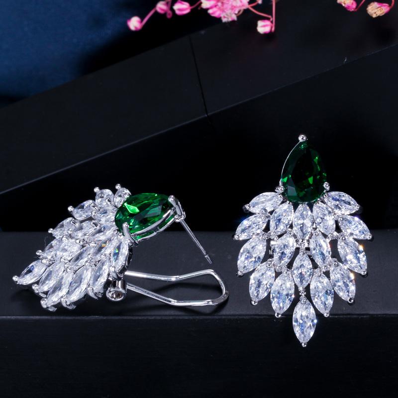 Большие серьги-гвоздики зеленого цвета с цирконием CMM огранки «маркиза» серебряного цвета