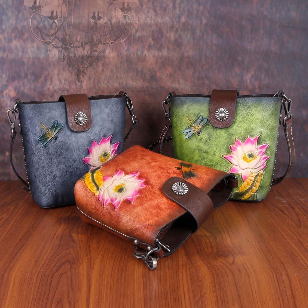 Johnature Женская сумка из коровьей кожи в стиле ретро, маленькие сумки-ведра с тиснением ручной работы, сумки на плечо и через плечо