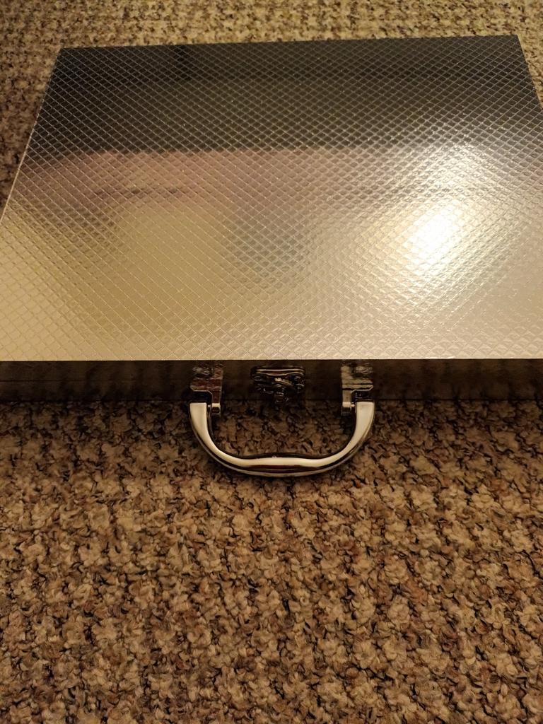 Смотрится красиво, но снаружи чемоданчик просто обклеен фольгой, на углах заминается. Фурнитура хорошая: ручка, защёлка - супер. Внутри обклено бархатной бумагой, резинки для столовых приборов довольно крепкие